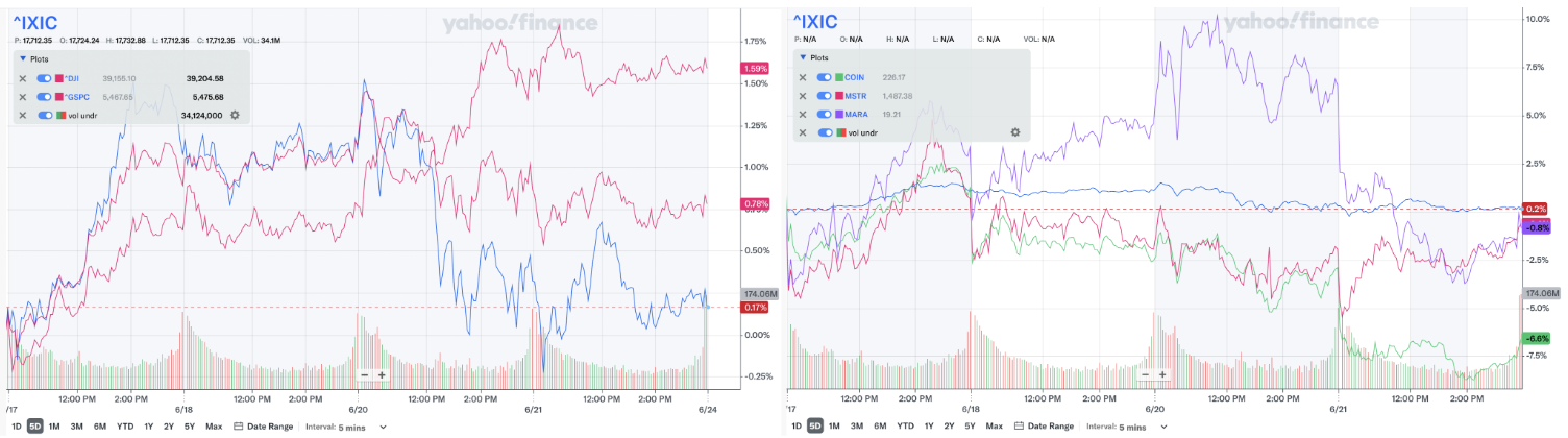 Left: Three Indexes, Right: Nasdaq, COIN & MARA & MSTR (Source: Yahoo Finance)