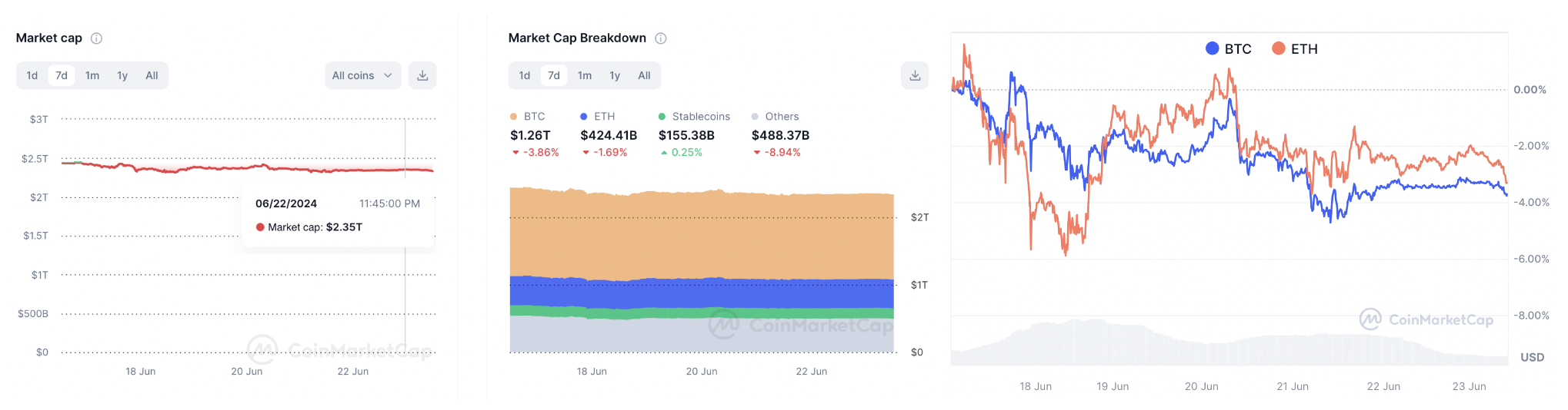 Last week, the total market capitalization of the cryptocurrency market showed a volatile downward trend, currently standing at $2.35 trillion. Due to continued high inflation pressure, Bitcoin and Ethereum experienced a brief drop early last week, followed by a slight rebound. As of the early hours of June 23rd, the spot price of Bitcoin was $64,000, down nearly 4% over the past seven days. Ethereum, the second-largest cryptocurrency, was priced at $3,500, down nearly 3.7% over the same period. Additionally, the market capitalizations of Bitcoin and Ethereum were approximately $1.26 trillion and $424 billion, respectively, shrinking by 3.9% and 1.7%, accounting for about 54% and 18% of the total market capitalization. The market share gap between Bitcoin and Ethereum has narrowed compared to recent times.
