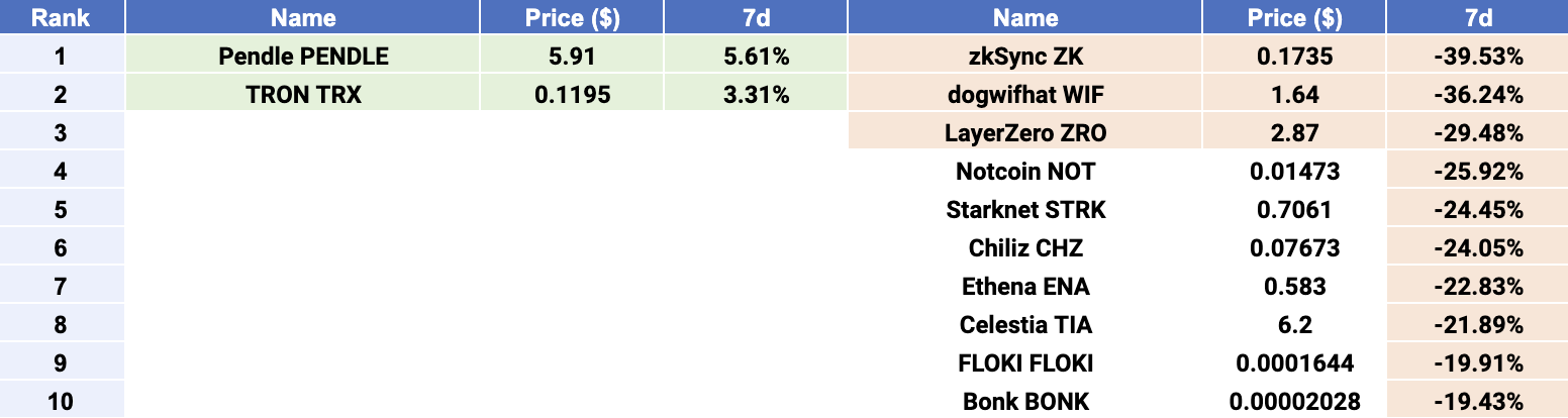 $PENDLE, $TRX emerged as Only 2 gainers, while $ZK, $WIF, and $ZRO were Top 3 losers. In the top 100 cryptocurrencies by market capitalization last week, altcoins as a whole had a tough week. $PENDLE and $TRX were the only gainers, while most altcoins experienced significant pullbacks, with meme coins being particularly hard hit. Pendle ($PENDLE), the top gainer, is a protocol that enables the tokenization and trading of future yield. With the creation of a novel AMM that supports assets with time decay, Pendle gives users more control over future yield by providing optionality and opportunities for its utilization. Starting from June 18, $PENDLE rebounded from a low point and saw another increase on June 21. During this period, it was announced that Coinbase International Exchange and Coinbase Advanced added support for perpetual futures for Altlayer, Lido DAO, and Pendle. Previously, Pendle's TVL (Total Value Locked) exceeded $6.6 billion, hitting a record high. TRON ($TRX), the second gainer, is a decentralized blockchain-based operating system developed by the Tron Foundation and launched in 2017. Originally, $TRX tokens were ERC-20-based tokens deployed on Ethereum, but a year later, they were moved to their own network. Recently, it was announced that the number of new daily accounts reached nearly 320,000, a one-year high, and the community developers proposed a reduction in the cost of TVM's OP code operations.