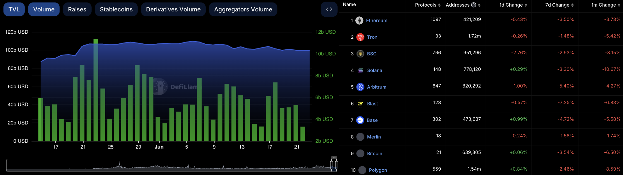 Left: TVL & Volume, Right: Top 10 chains (Data: DefiLlama)