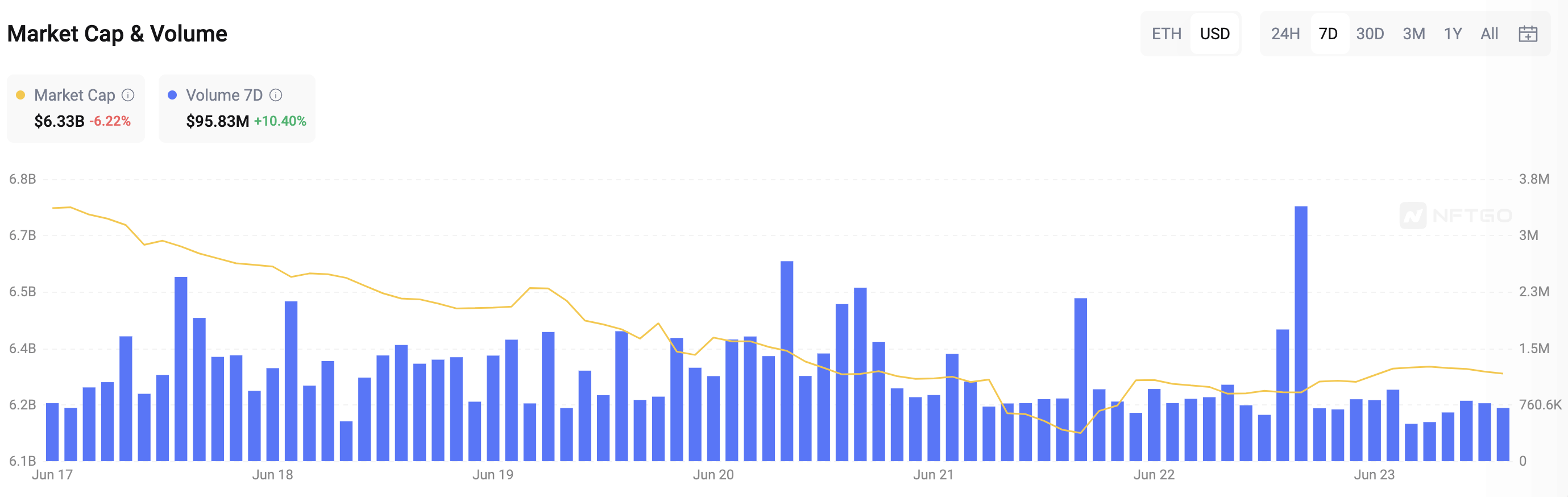 In the Ethereum non-fungible token (NFT) market, the total market value continued to decline by 6%, reaching $6.3 billion. Meanwhile, total trading volume increased by 10%, but the past seven days' trading volume remained below $100 million, specifically $95.8 million. Among Ethereum's leading blue-chip NFT series, the floor price of CryptoPunks decreased by 2%, while the average price rebounded by 29%. The floor price and average price of the second-ranked Bored Ape Yacht Club both fell by 11% and 16%, respectively. Currently, the third-ranked Pudgy Penguins saw its floor price drop by 11% and its average price decrease by 19%.