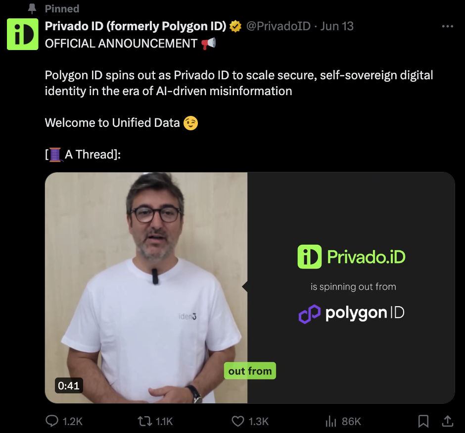 [Polygon] Polygon Labs Completes Spinout of ID Solution as 'Privado'. Polygon Labs, primary developer behind Ethereum scaling project Polygon, has completed its spinout of its ID solution as "Privado ID," according to a press release. The "protocol-agnostic design, from the team behind the Iden3 Protocol and Polygon ID, is posed for expansion beyond the Polygon networks.... Privado ID is actively establishing strategic partnerships with onchain and institutional organizations alike. These include notable proof-of-concepts (PoC) with several multinational banking and financial service companies, aimed at establishing the technical groundwork for interoperable and compliant identity frameworks.... The PoCs also explore leveraging Privado ID’s verifiable credentials (VCs) as the access control point for permissioned financial transactions." (MATIC)