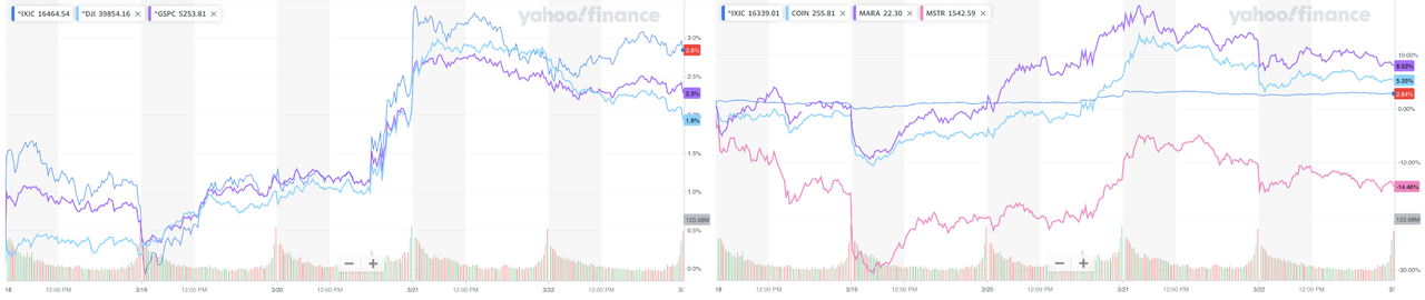 Left: Three Indexes, Right: Nasdaq, COIN & MARA & MSTR (Source: Yahoo Finance)
