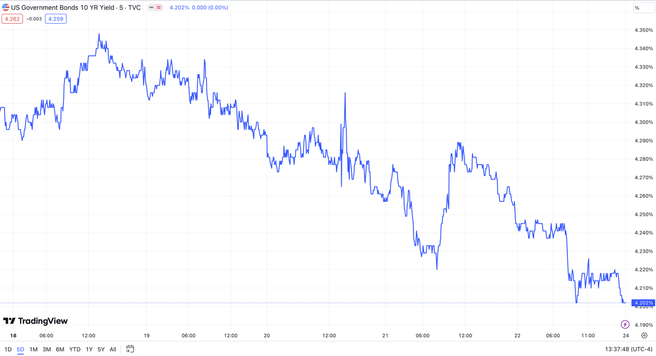 The yield on the 10-year U.S. Treasury note (US10Y) experienced a decline last week, closing at 4.202% on Friday. Similar to the trend of the US Dollar Index, it began to decrease following the impact of interest rate policy comments received on Wednesday, sliding from the previous week's level of 4.310%.