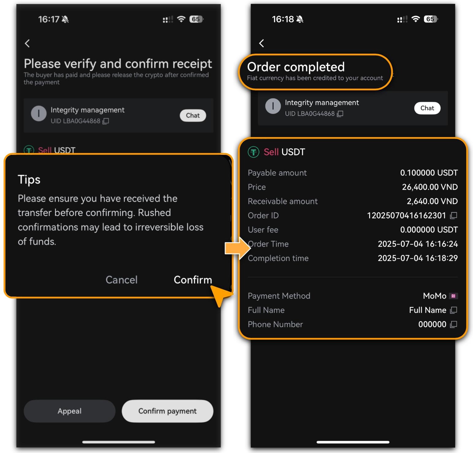 بمجرد أن تتأكد من استلام الدفع بالكامل في حسابك، انقر على 「تأكيد الدفع」> 「تأكيد」من أجل تحرير العملات المشفرة إلى المشتري وإكمال المعاملة.