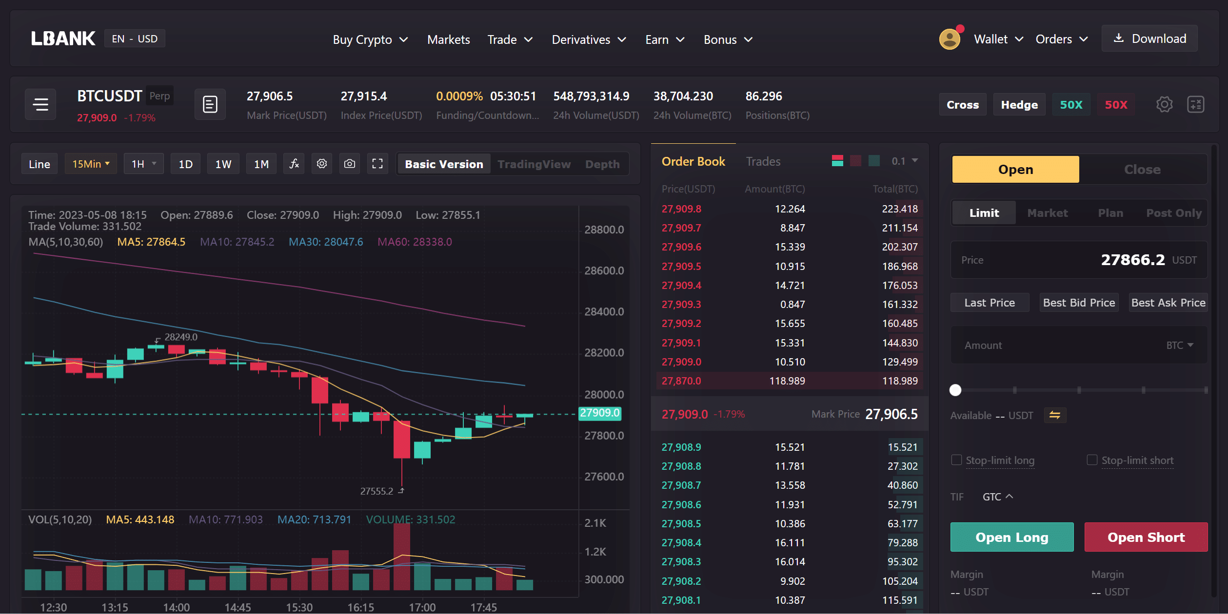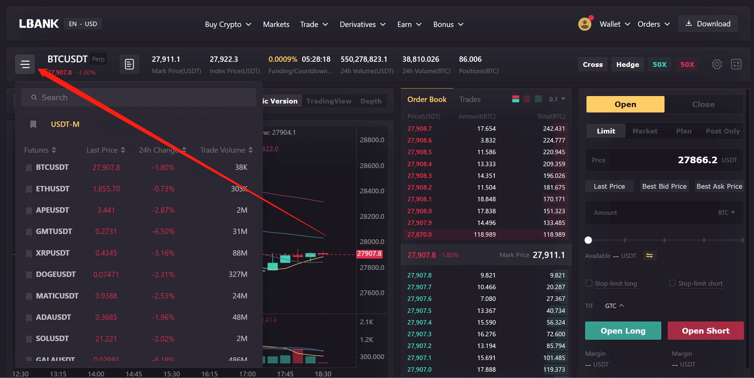 2. أنت الآن في واجهة تداول عقود BTC/USDT.