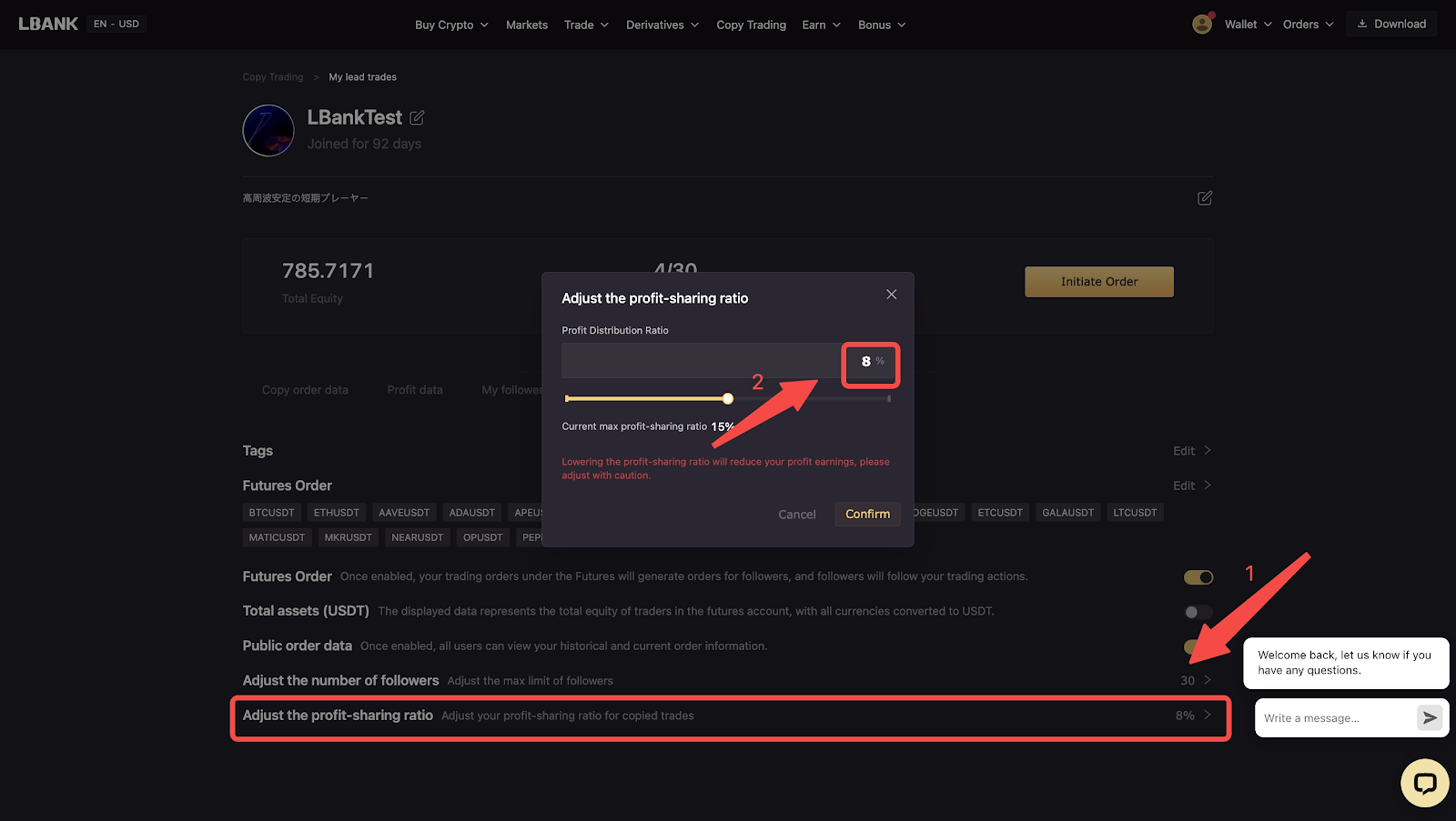 يمكن للمتداولين بالنسخ تعديل نسبة مشاركة الأرباح الفعلية الخاصة بهم ضمن النطاق [1، أقصى نسبة] في الإعدادات الشخصية.