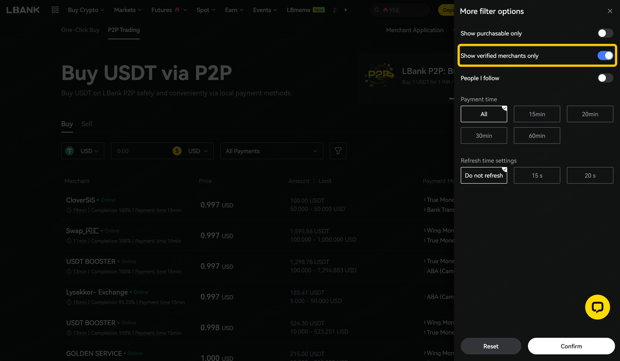 Ein neuer Filter für verifizierte Händler ermöglicht es Nutzern, schnell von LBank zertifizierte P2P-Händler zu finden.