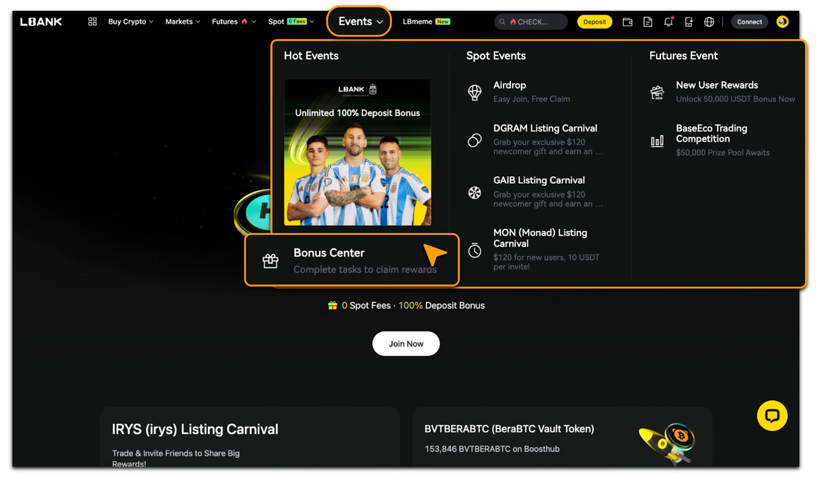 📌 Alle laufenden Events sind zeitlich begrenzt. Die detaillierten Zeitpläne finden Sie jederzeit in den aktuellen Informationen im LBank Bonus-Center. Dieser Leitfaden zeigt Ihnen, wie Sie das Bonus Center effektiv nutzen..