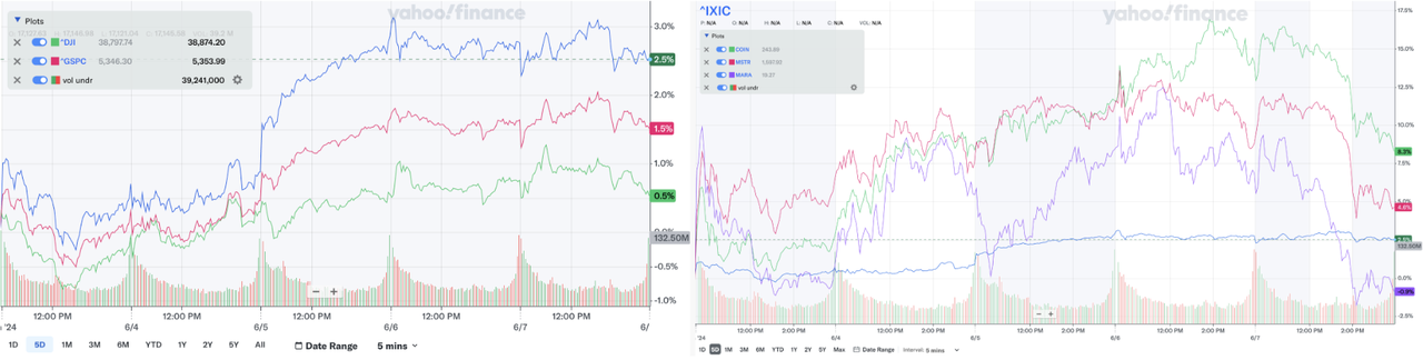 Left: Three Indexes, Right: Nasdaq, COIN & MARA & MSTR (Source: Yahoo Finance)