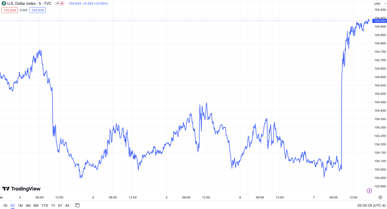 Last week, the U.S. Dollar Index (DXY) reversed its downward trend following the release of an overheated employment report on Friday, closing at 104.934. This marks an increase from the previous week's closing value of 104.625.