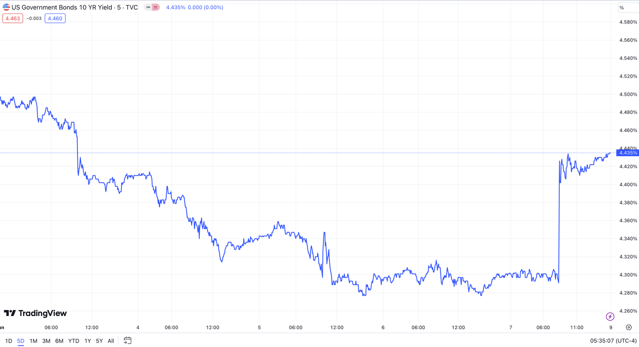 Bond yields rose as investors’ expectations about interest rates shifted. The yield on the 10-year Treasury note (US10Y), a benchmark for mortgages and other borrowing costs, jumped to 4.435% Friday, from 4.280% Thursday—its largest one-day gain in two months.