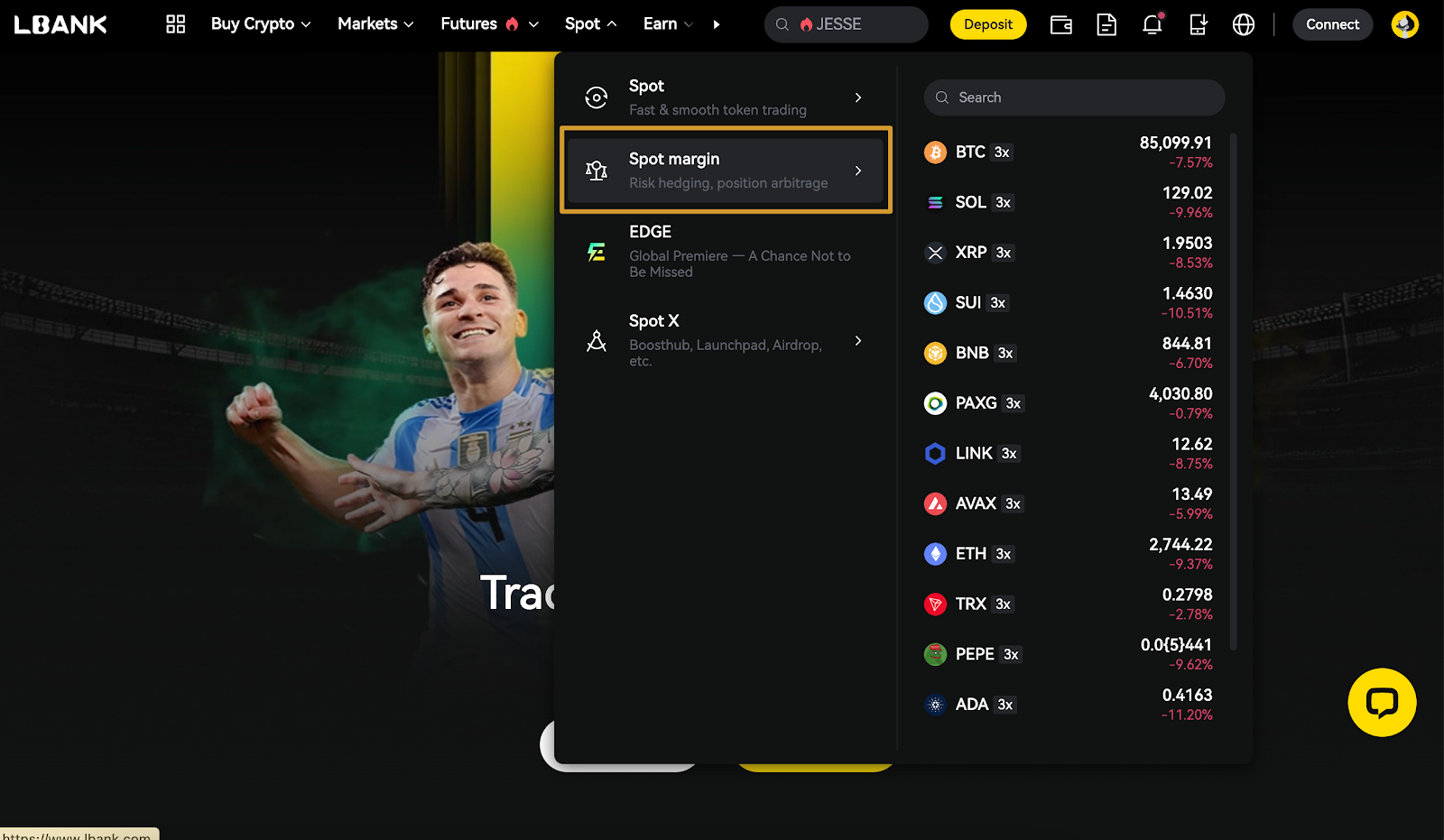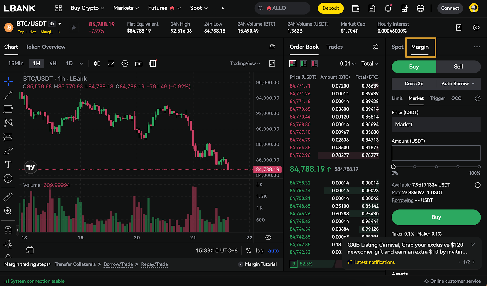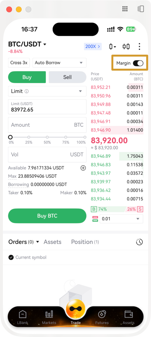 Entrar al Modo Margen: En la página de trading spot de LBank, cambia a Modo Margen.