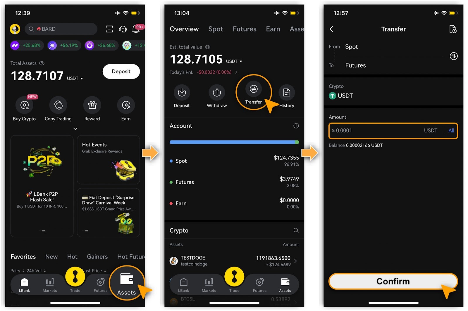 Método 1: Transfiere USDT u otros activos de margen desde la cuenta spot a la cuenta de futures. Ve a 「Activos > Transferir」, selecciona de 「Spot」 hacia 「Futuros」, ingresa el monto y toca 「Confirmar」.