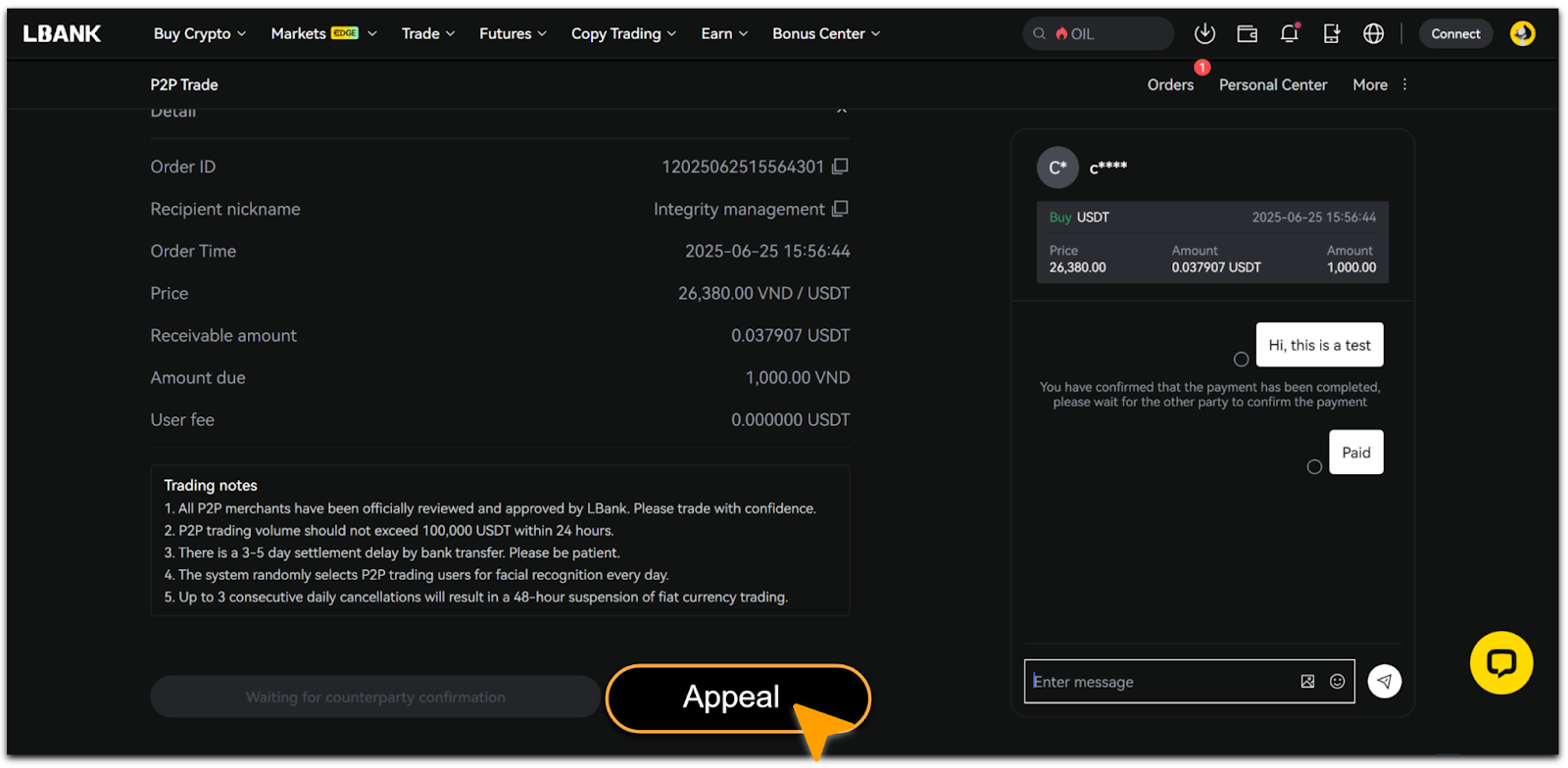 Si la criptomoneda no se libera después de que hayas confirmado el pago, haz clic en 「Apelar」 inmediatamente para ponerte en contacto con el Servicio de Atención al Cliente y obtener ayuda.