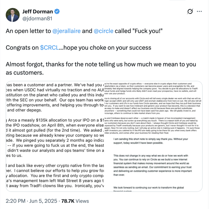 Circle's IPO allocation process created unexpected backlash from crypto insiders. Jeff Dorman from Arca published a scathing critique on June 5, 2025. He accused Circle of betraying early supporters by giving them "horrible or zero allocations" of IPO shares. Meanwhile, traditional mutual funds and hedge funds received generous allocations.