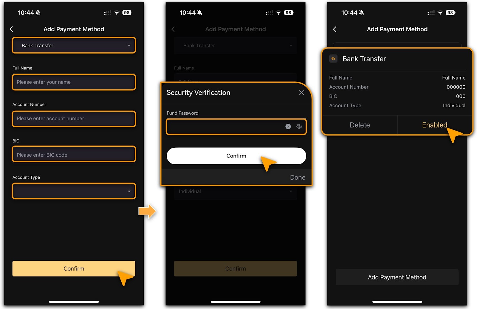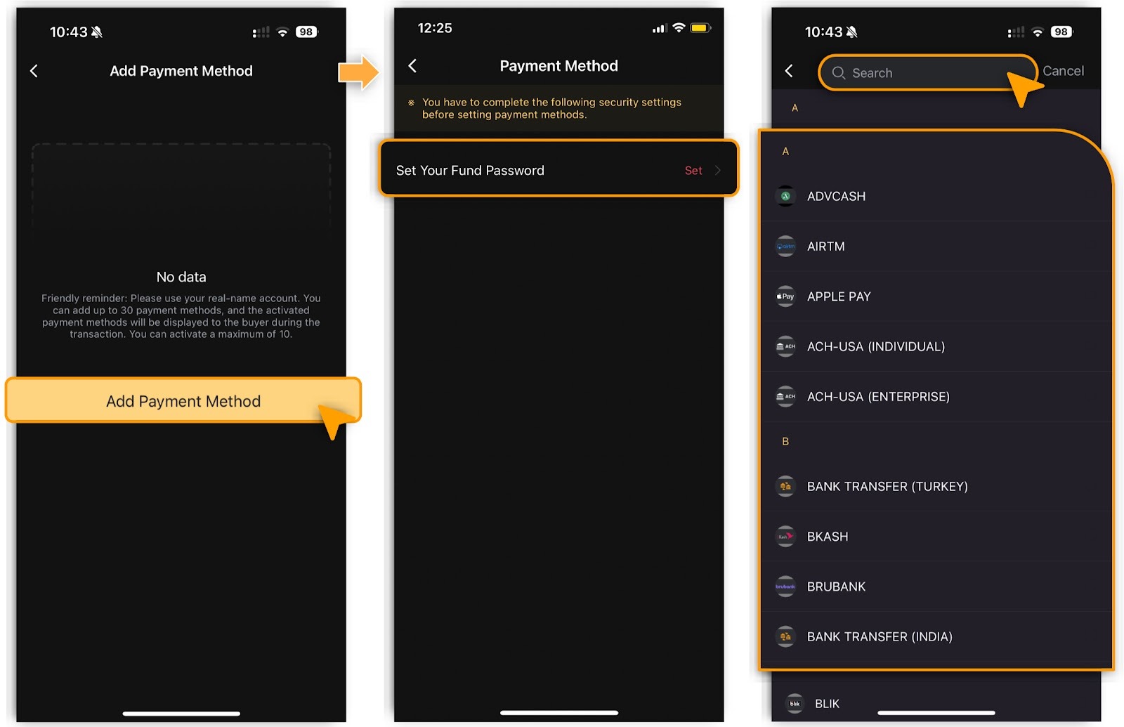 پیش از افزودن روش پرداخت، مطمئن شوید که احراز هویت را تکمیل کردهاید؛ شماره تلفن خود را متصل (Bind) کردهاید؛ رمز حفاظت دارایی (Fund Password) را تنظیم کردهاید.