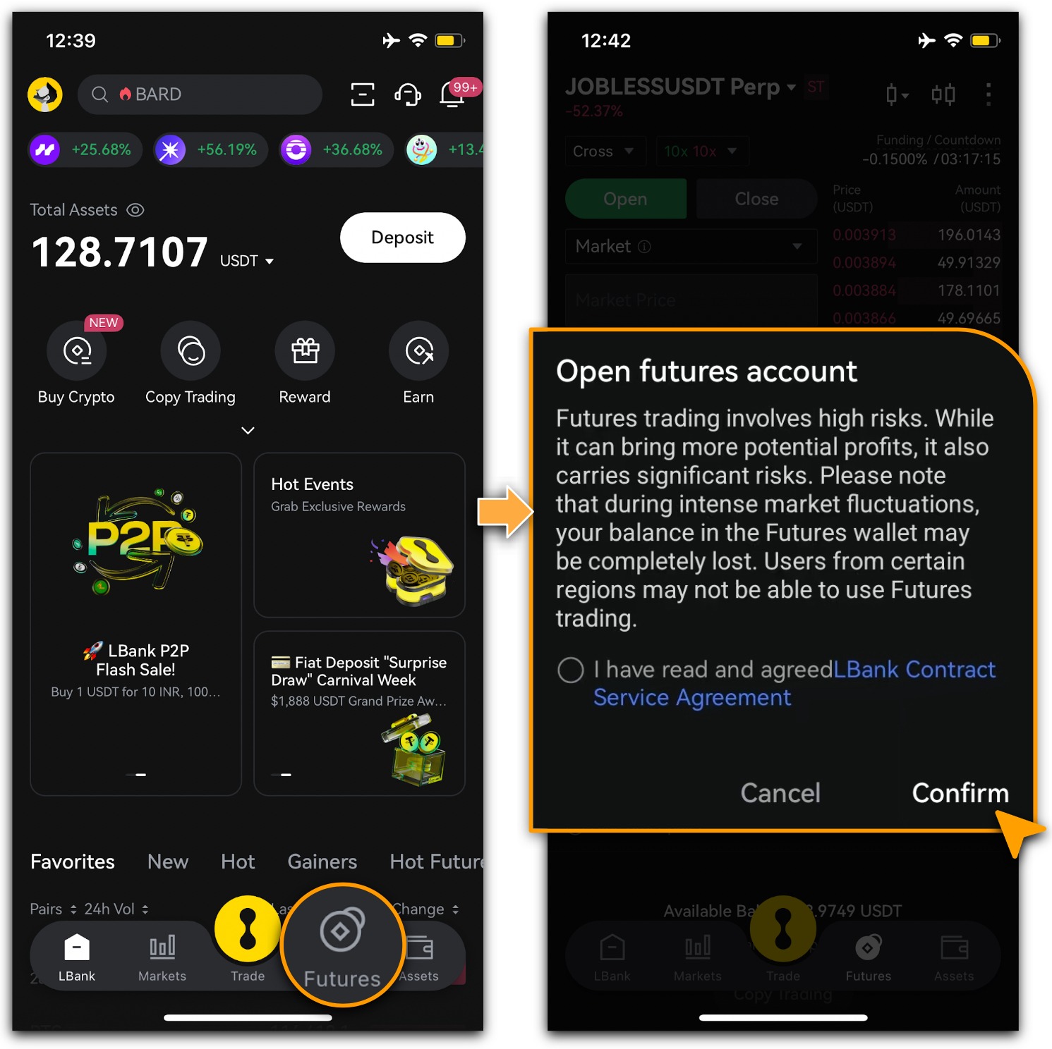 اپلیکیشن LBank را باز کنید، وارد حساب خود شوید و روی گزینه 「فیوچرز」 در منوی پایین ضربه بزنید. برای تکمیل تنظیمات، روی 「تایید」 ضربه بزنید تا با باز کردن حساب فیوچرز موافقت کنید.