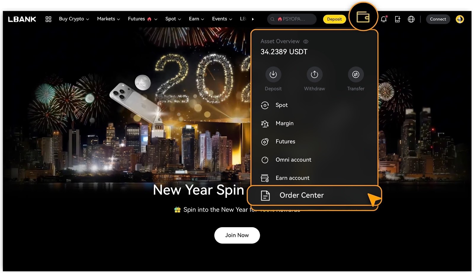 2. Click「Assets」in the top right corner, then select「Order Center」.