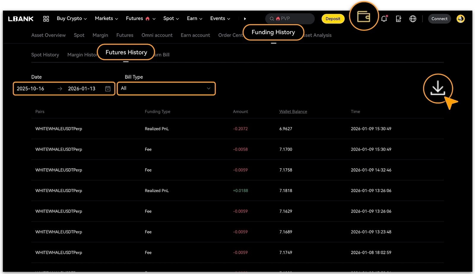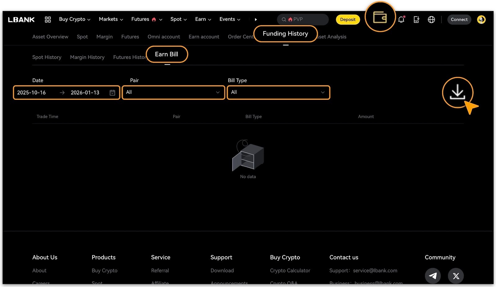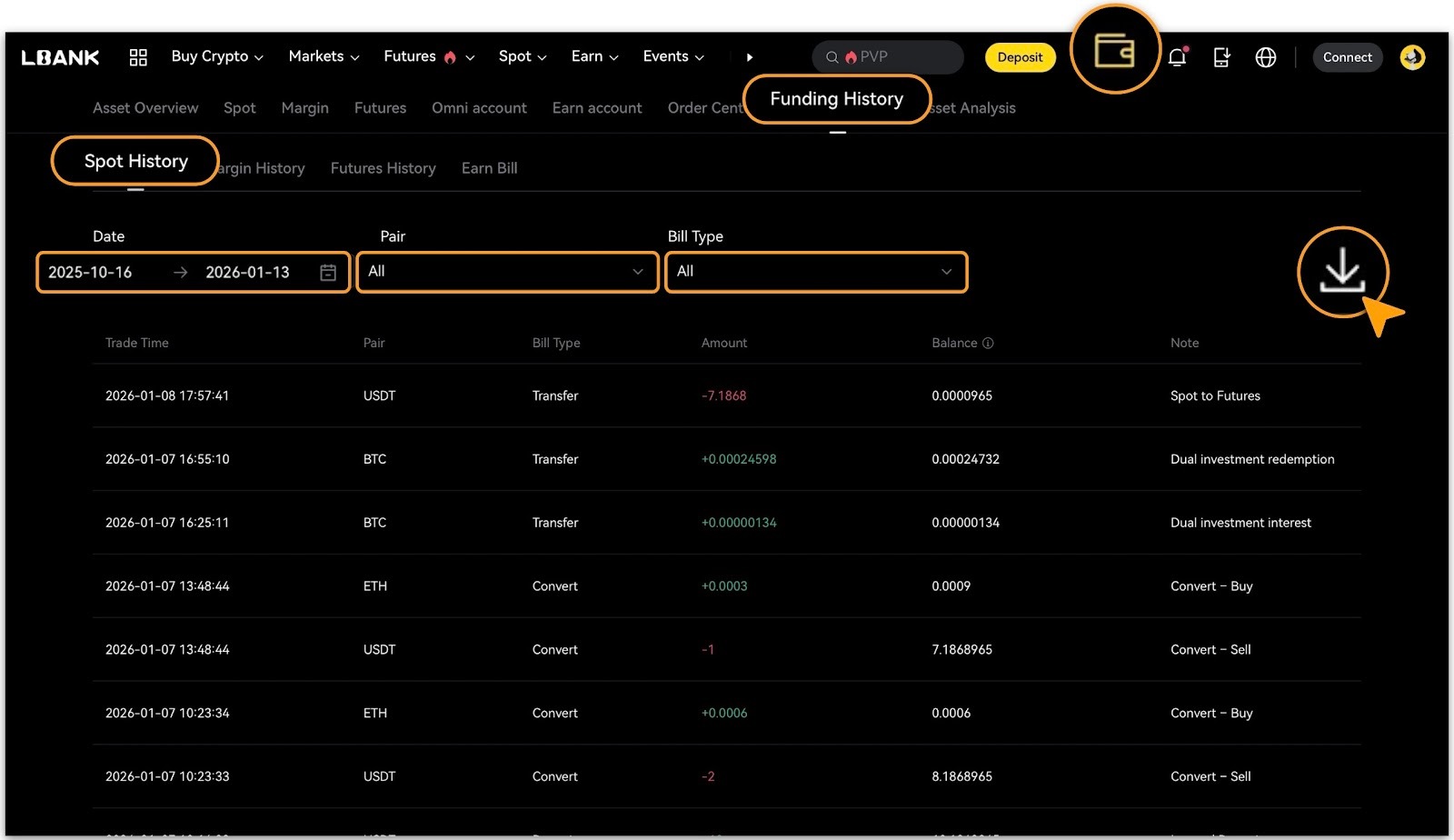 1. Currently, only the following categories「Spot History」,「Margin History」and「Futures History」support download;「Earn Bill」is available for online viewing only.