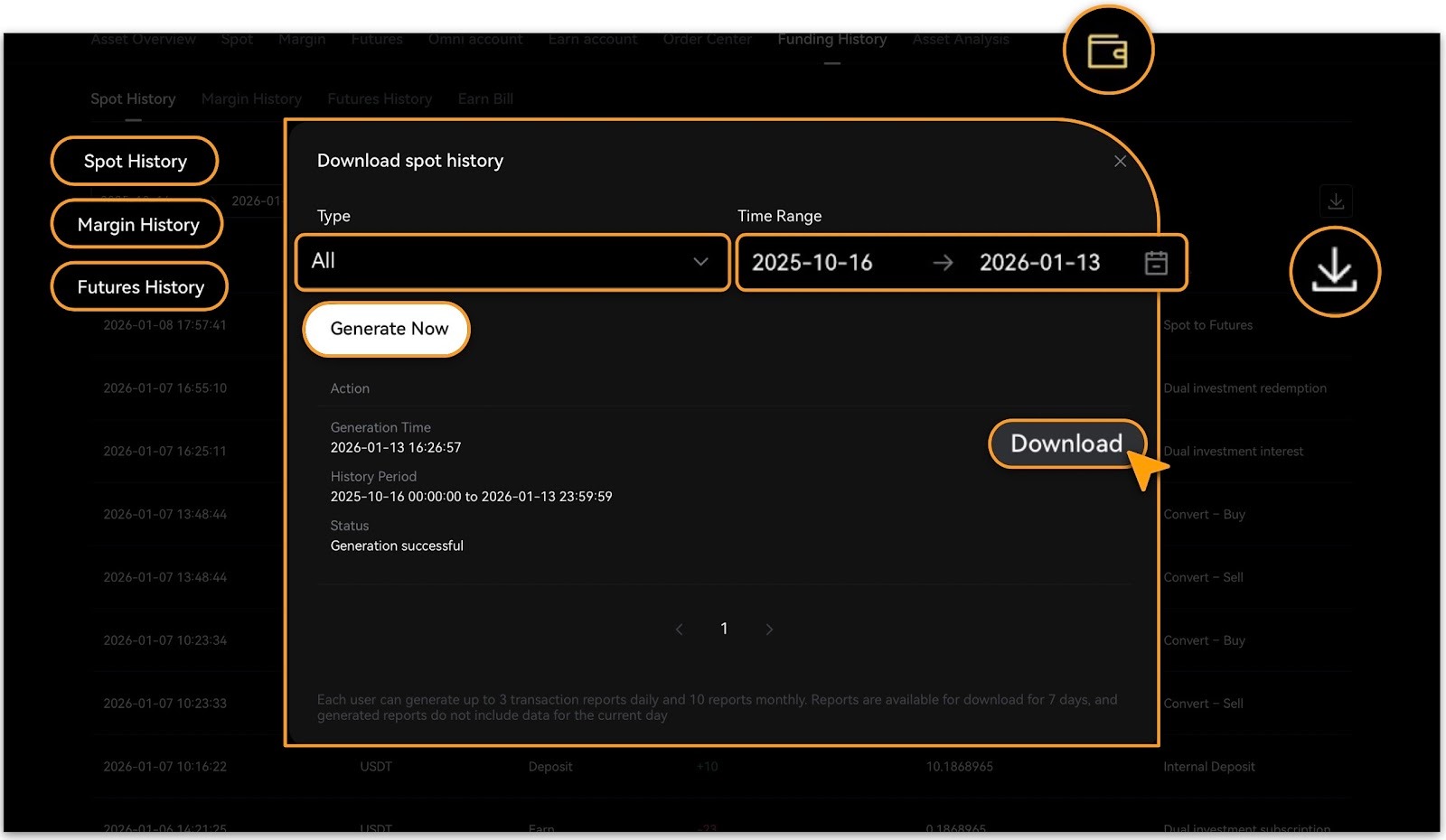 2. In the corresponding Transaction History section: tap「Download🔘」button, confirm「Type」and「Time Range」, tap「Generate Now」to create the report;