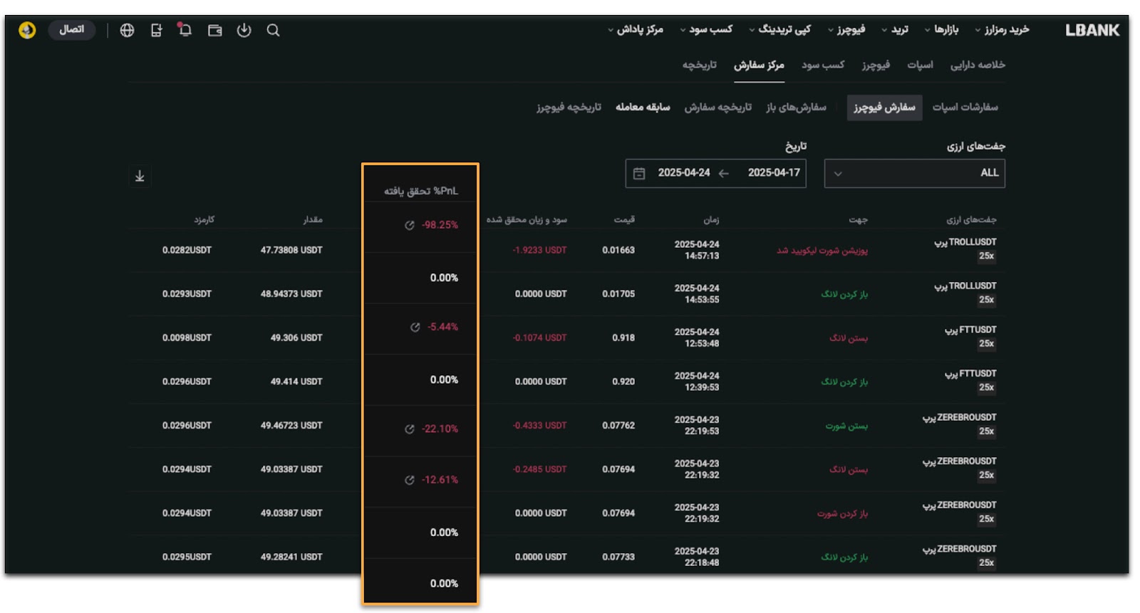 - درصد سود و زیان تحقق یافته (PnL%) شاخصی است که سود یا زیان واقعی پس از بستن یک موقعیت را نشان میدهد و بیانگر تغییر سرمایه و نرخ بازگشت سرمایه (ROI) پس از پایان معامله است.