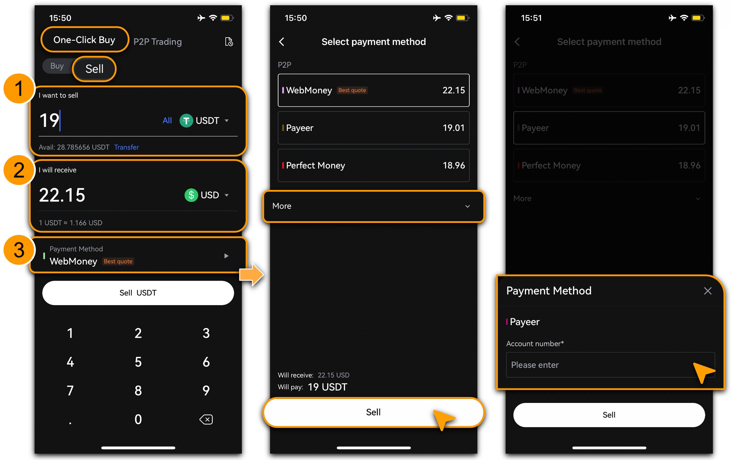 Saisissez les coordonnées du compte de réception comme indiqué, puis appuyez sur [Vendre].