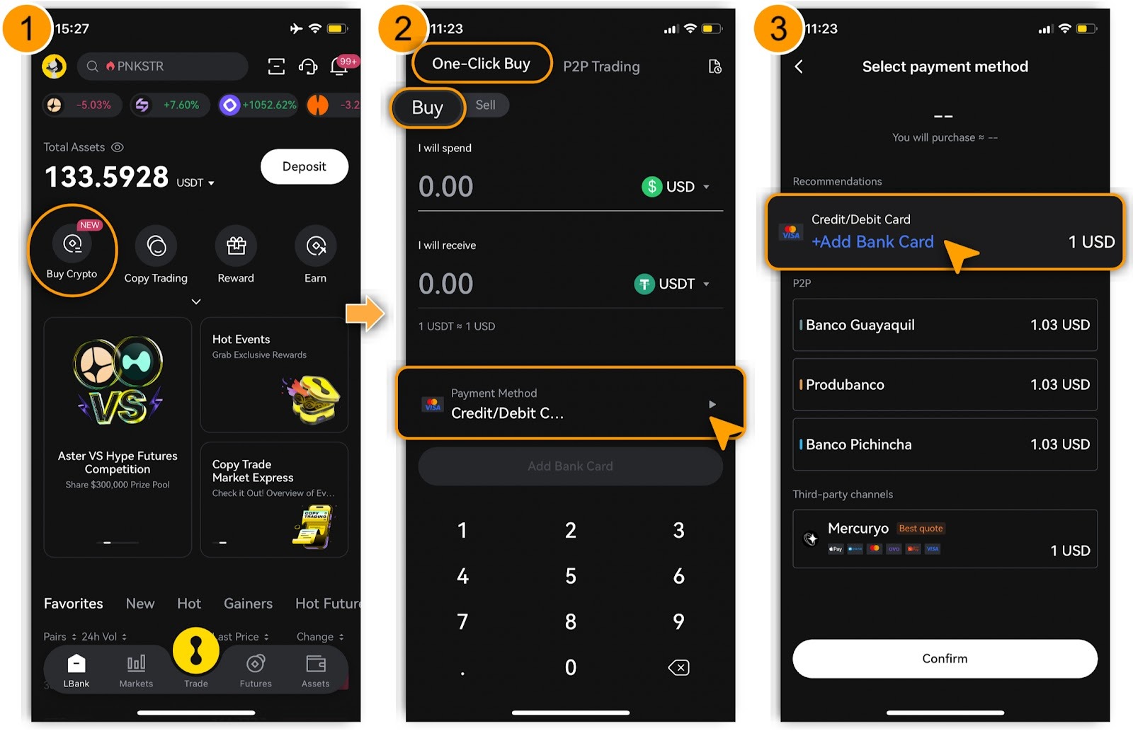 En tant qu’utilisateur LBank, vous pouvez facilement acheter des cryptomonnaies telles que USDT, USD1, BTC, ETH ou USDC en utilisant une carte de crédit ou de débit (désignées collectivement comme « carte bancaire »). LBank prend en charge plus de 115 devises Fiat (par ex. USD, EUR, TWD) et des méthodes de paiement telles que Visa et MasterCard. Chaque compte peut ajouter jusqu’à 5 cartes bancaires. Le processus est sécurisé, efficace et s’effectue généralement en quelques minutes. Ci-dessous, un guide détaillé étape par étape. Assurez-vous que votre compte a terminé la vérification KYC avant de continuer.