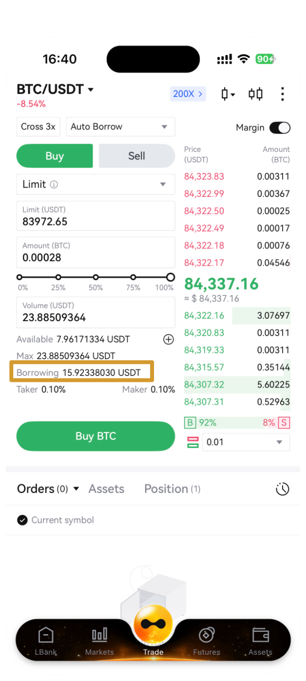 Accéder au Mode Marge : Sur la page de trading Spot de l’application LBank, passez en [Mode Marge].