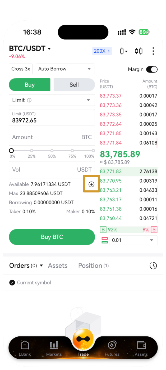 2. Transférer des fonds : Cliquez sur le bouton “+” dans la zone de trading pour transférer des actifs vers votre [Compte Marge].