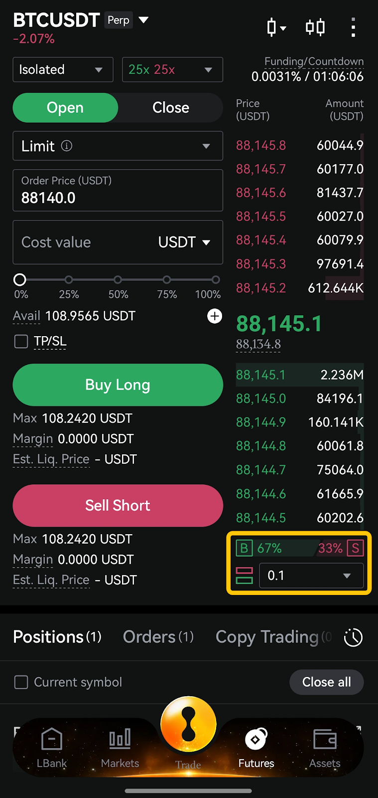 Le carnet d’ordres Spot et Futures sur l’App affiche désormais le Ratio d’achat/vente, aligné avec l’expérience Web, afin d’aider les utilisateurs à évaluer rapidement le sentiment actuel du marché.