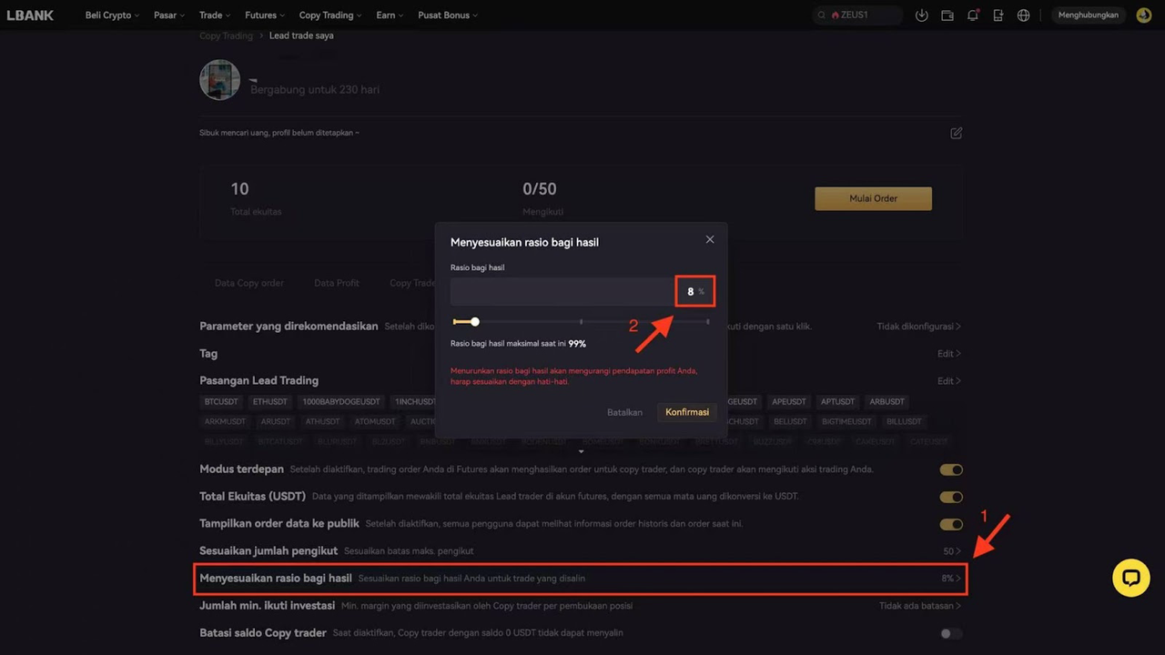 Copy trader dapat menyesuaikan rasio bagi hasil aktual mereka dalam rentang [1, Rasio Maksimum] melalui menu Pengaturan Pribadi.