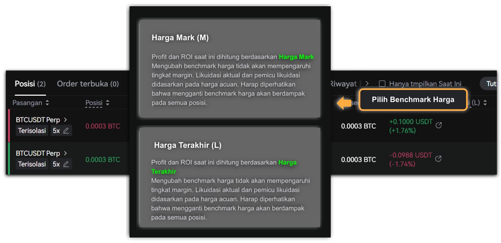 - Secara default, PnL yang belum direalisasikan ditampilkan berdasarkan harga terakhir. Pengguna dapat beralih untuk menghitungnya menggunakan harga mark atau harga terakhir.
