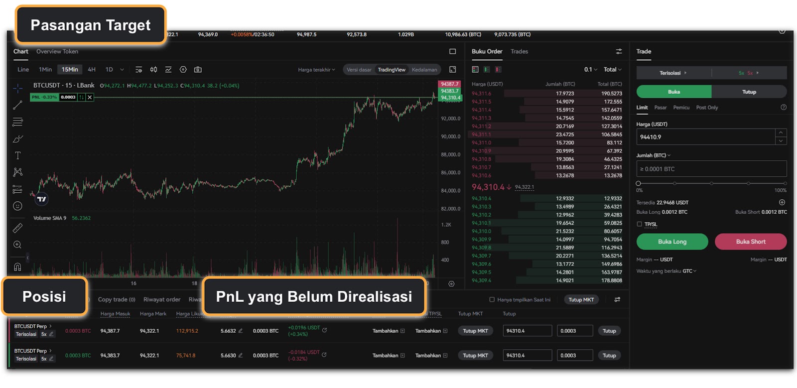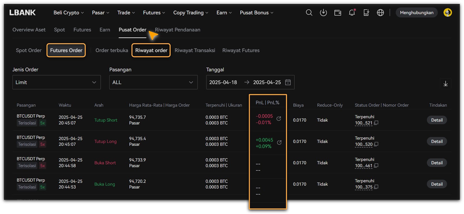 - Perhitungan PnL yang belum direalisasikan tidak termasuk biaya trading, biaya penutupan, atau biaya pendanaan yang terjadi selama pembukaan, penutupan, atau penahanan posisi.