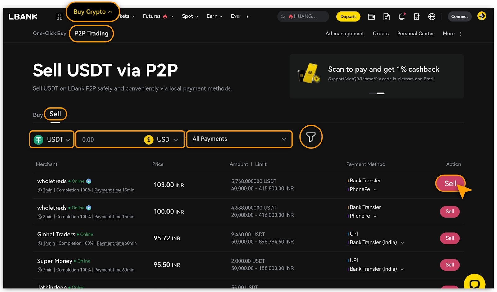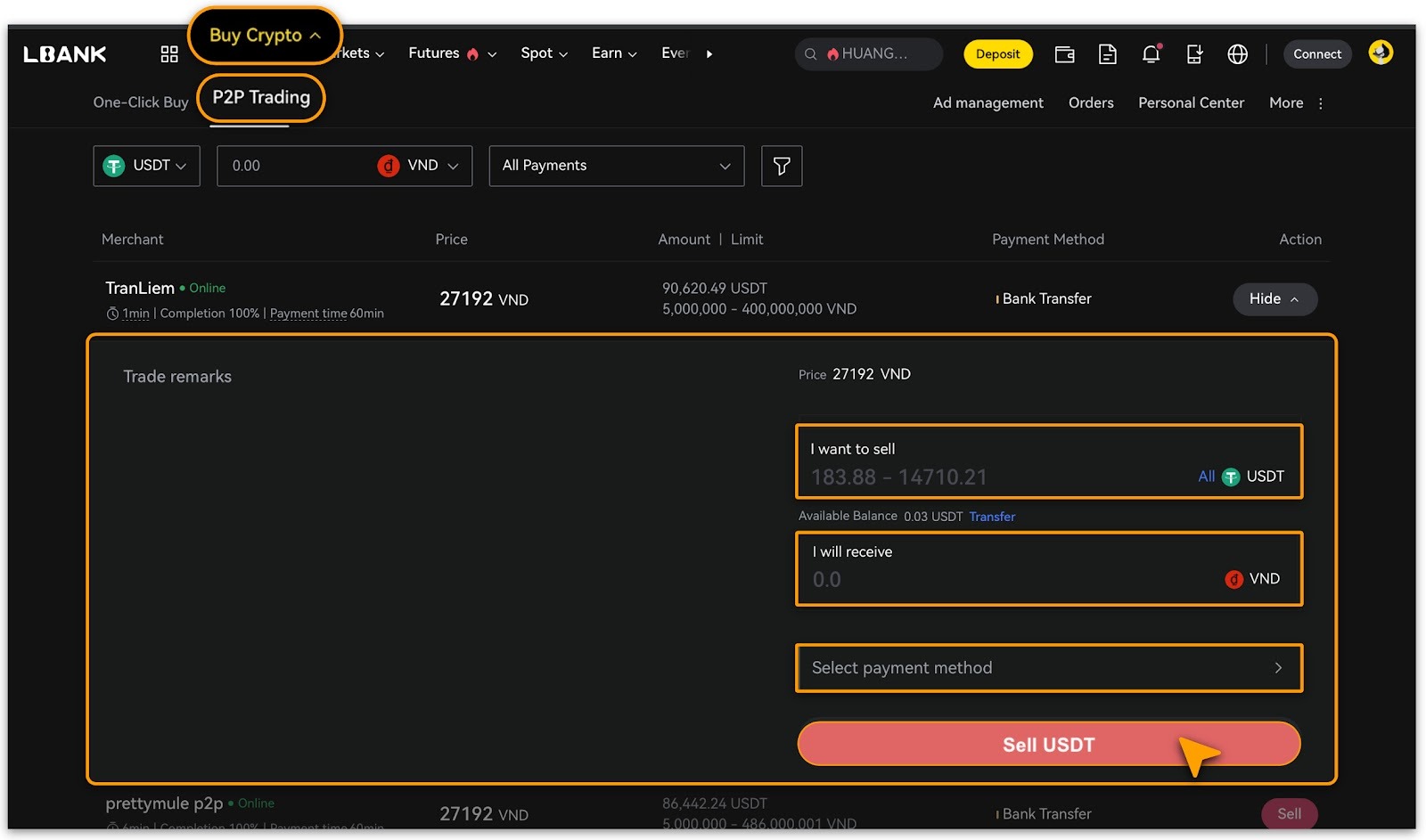 LBank P2P memungkinkan pengguna untuk trade crypto secara langsung dengan mata uang fiat. Tetapkan harga yang diinginkan, pilih metode pembayaran, dan selesaikan transaksi aman dan efisien yang dilindungi oleh layanan escrow LBank.