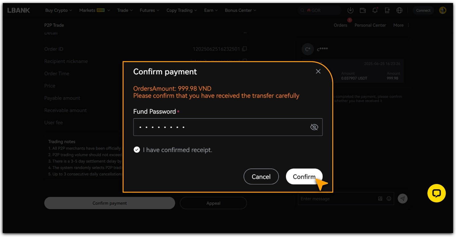 Crypto yang dijual melalui P2P akan disimpan dalam escrow oleh platform hingga Anda mengonfirmasi penerimaan pembayaran.