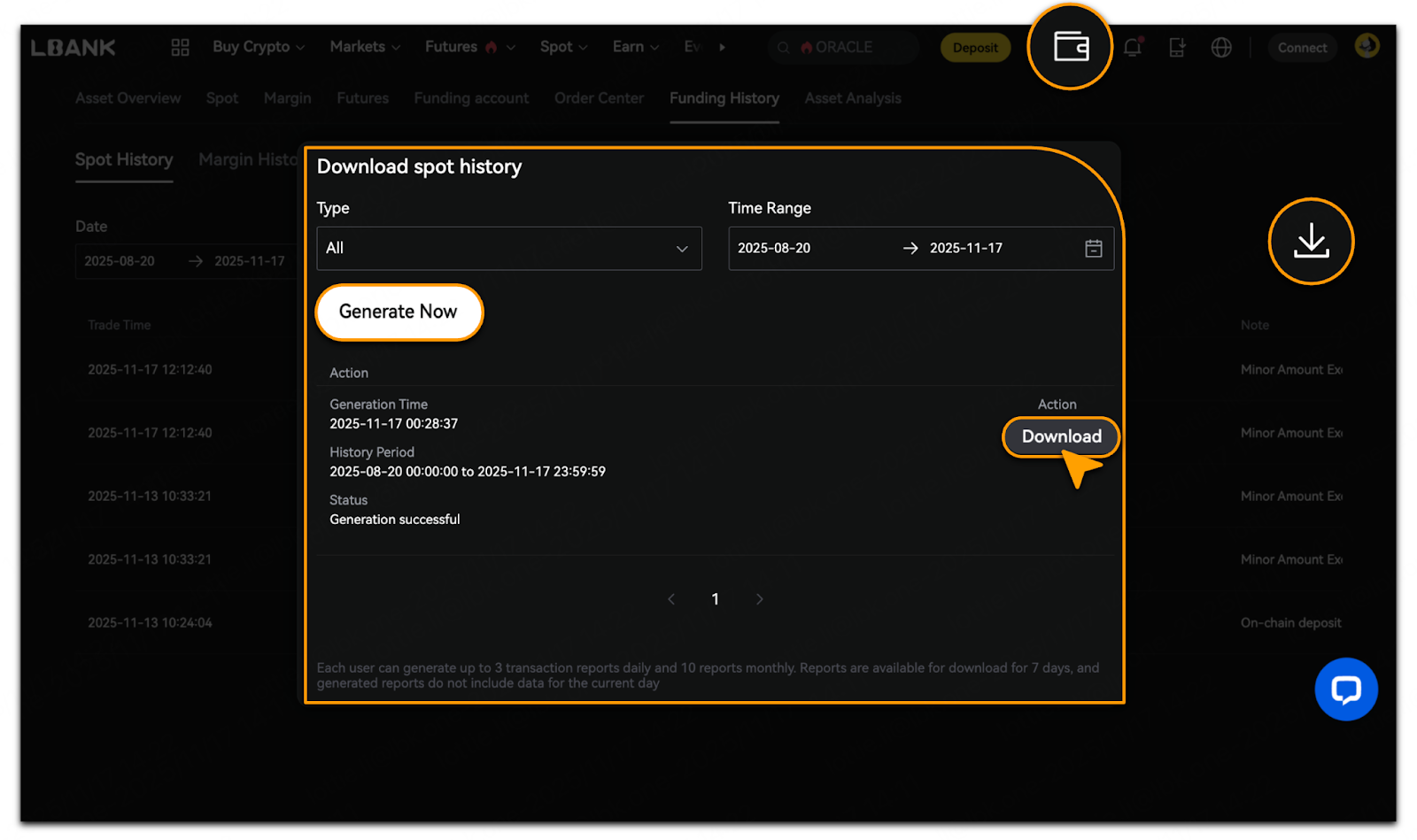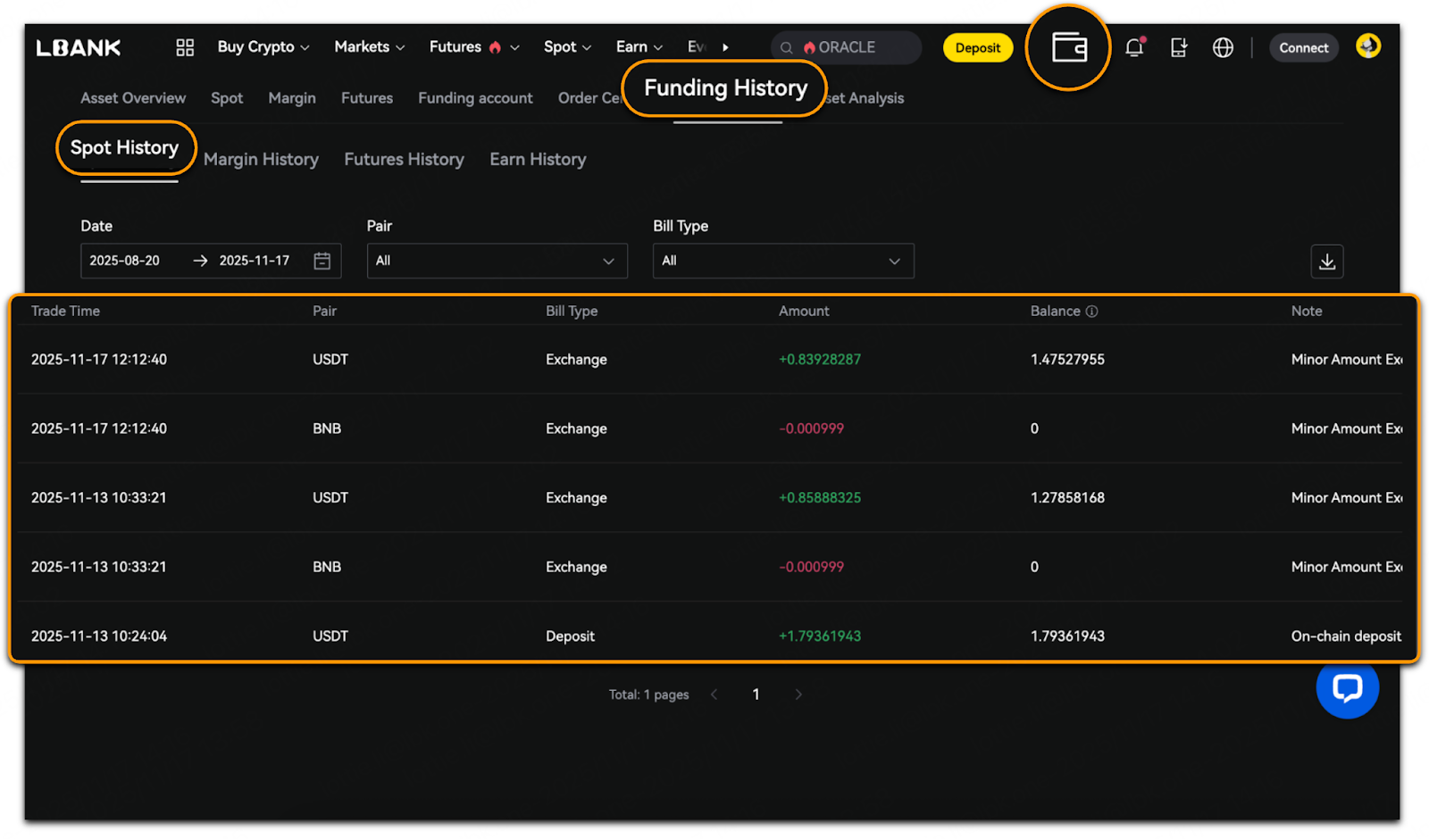 Zobacz szczegółowe zapisy poprzez 「Historię Finansowania」>「Historia Spot」.