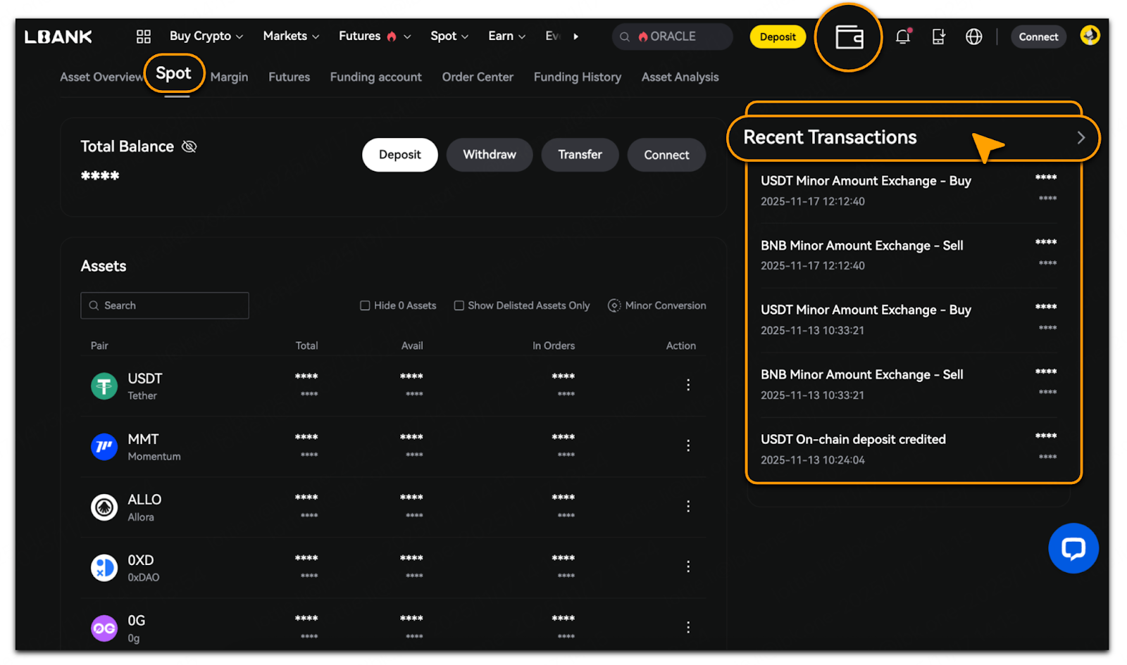 Wybierz「Spot」>「Ostatnie transakcje」;
