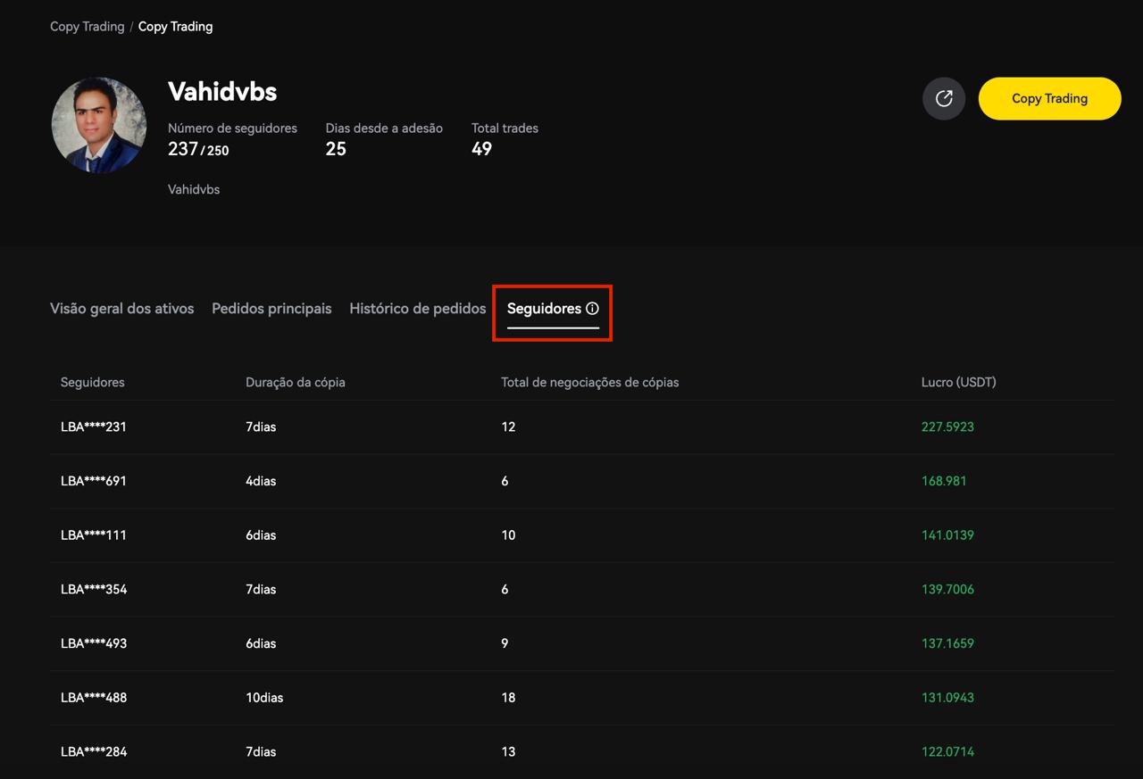 Clique em "Seguidores" na página "Detalhes do Lead Trader" para ver os copiadores do Lead Trader. Apenas os 100 principais Copy Traders são exibidos.