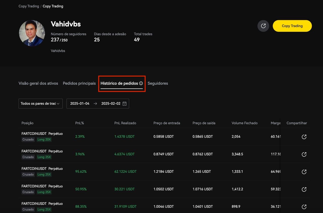 Os copiadores podem verificar "Ordens do Lead", "Histórico de Ordens" e "Copy Traders" na página de Detalhes do Lead Trader.