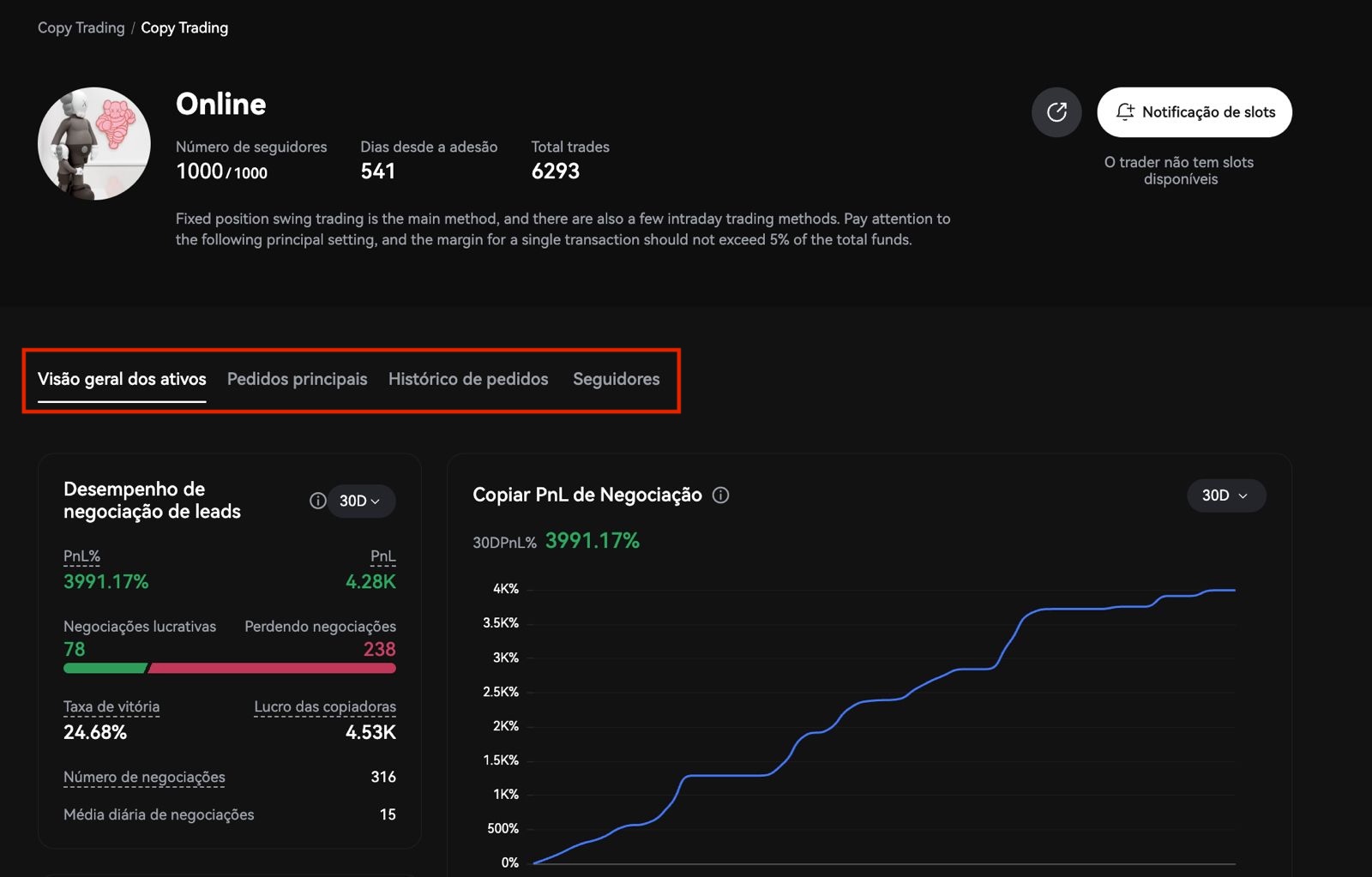 a. Entre pela página "Copy Trading", clicando no cartão do Lead Trader para acessar a página "Detalhes do Lead Trader".