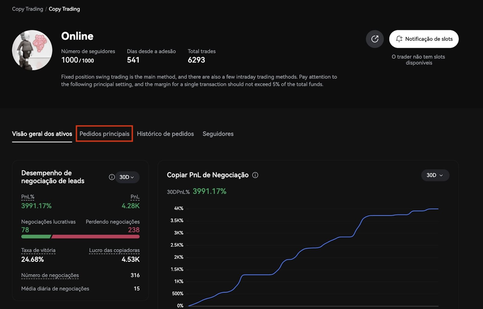 - Na página "Detalhes do Lead Trader", você pode visualizar os dados gerais do Lead Trader, além das informações sobre "Pedidos principais", "Histórico de pedidos" e "Seguidores".