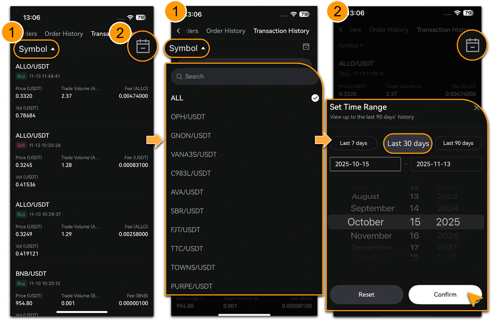 Toque em 「Símbolo」 para filtrar e buscar pares de trading específicos;