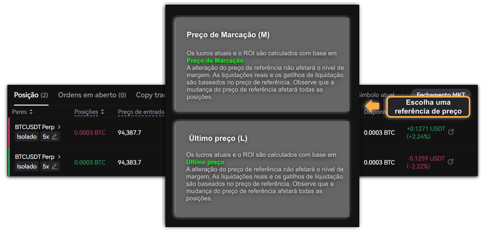- Por padrão, o PnL não realizado é exibido com base no último preço, mas é possível alternar para usar o preço de marcação (mark price).