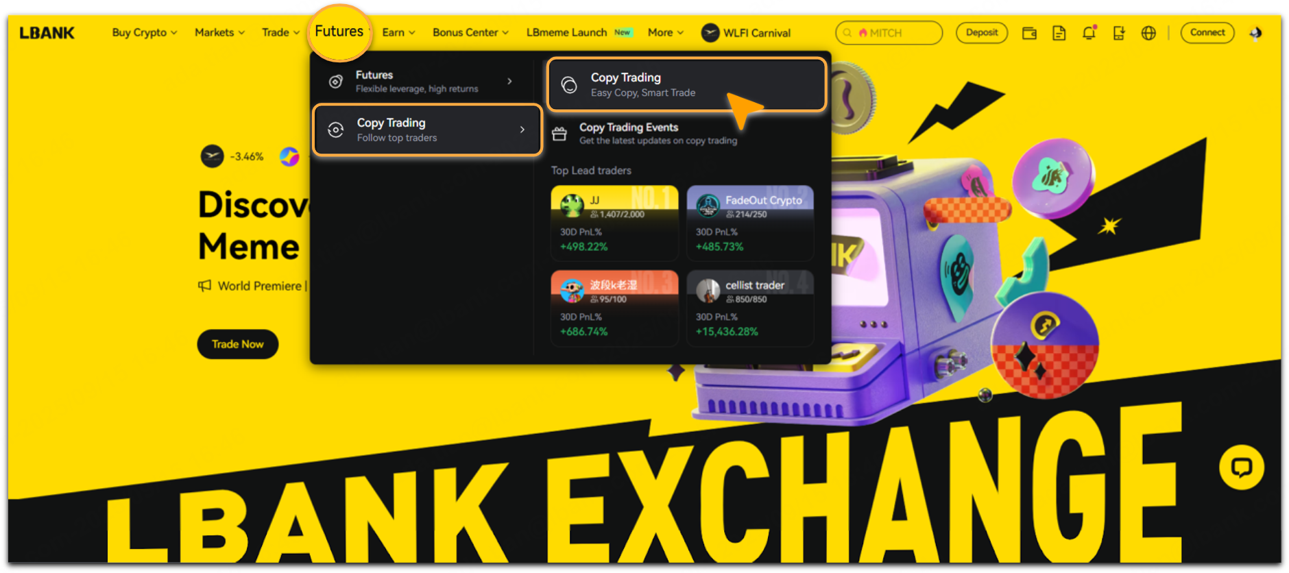 Log in to the LBank Account, tap 「Futures」-「Copy Trading」, select「Copy Trading」.