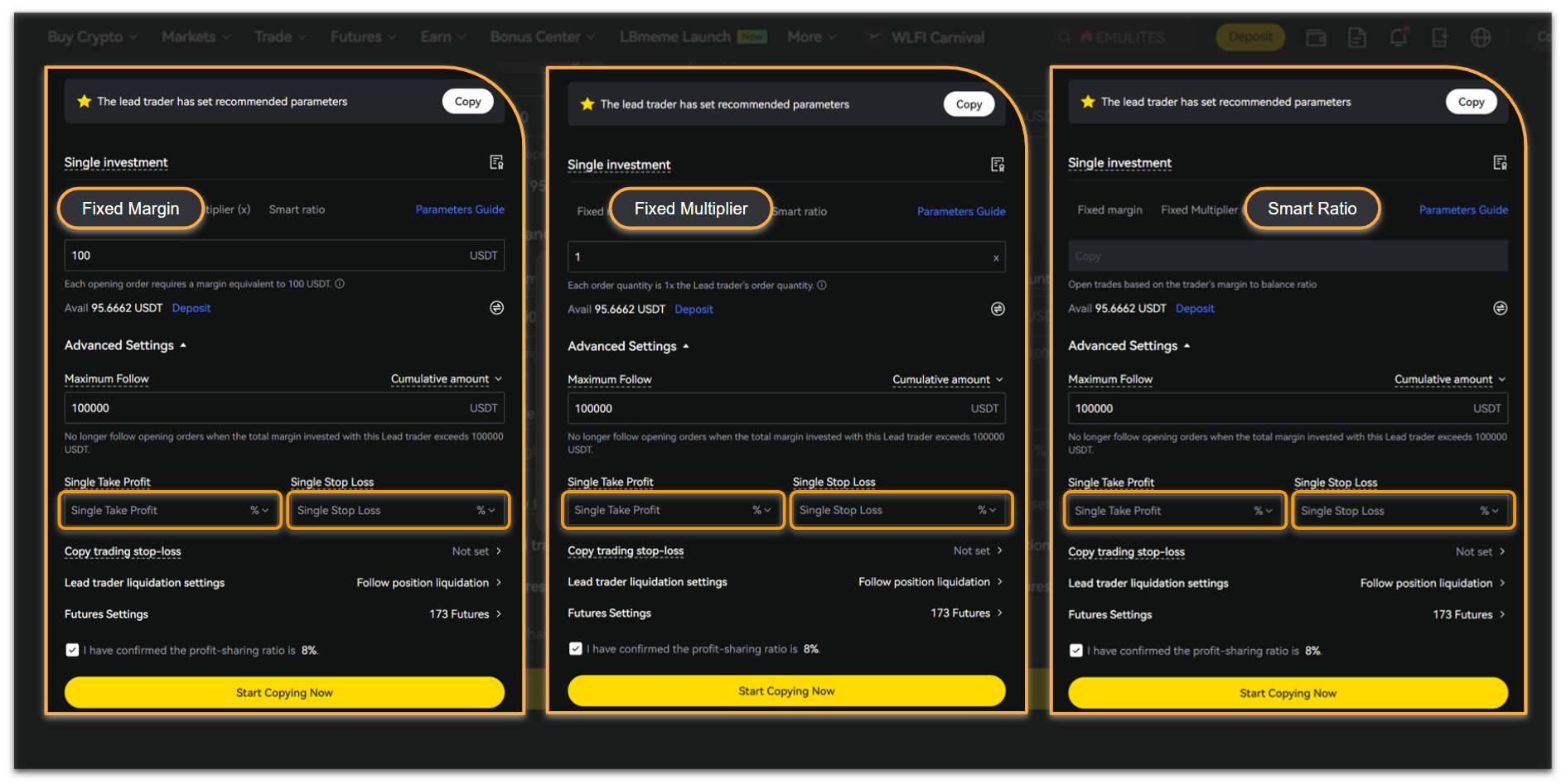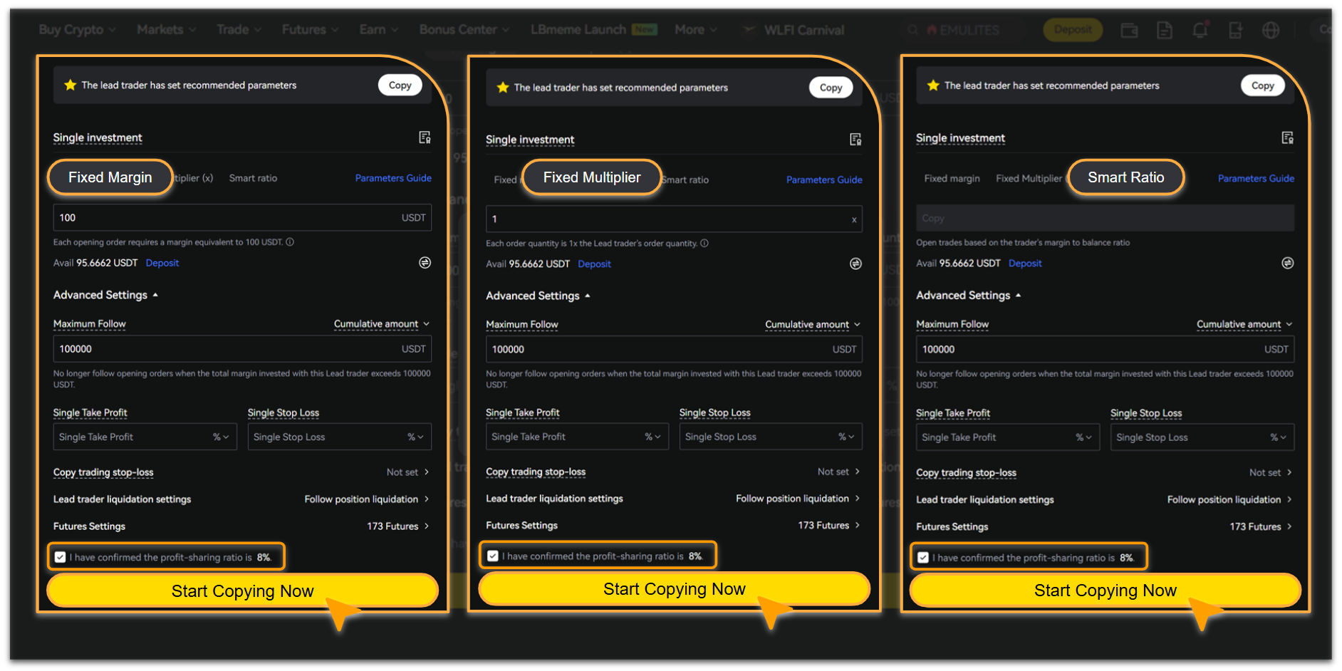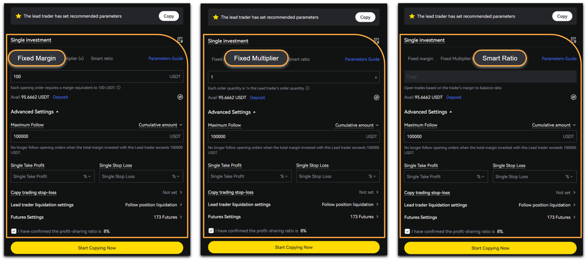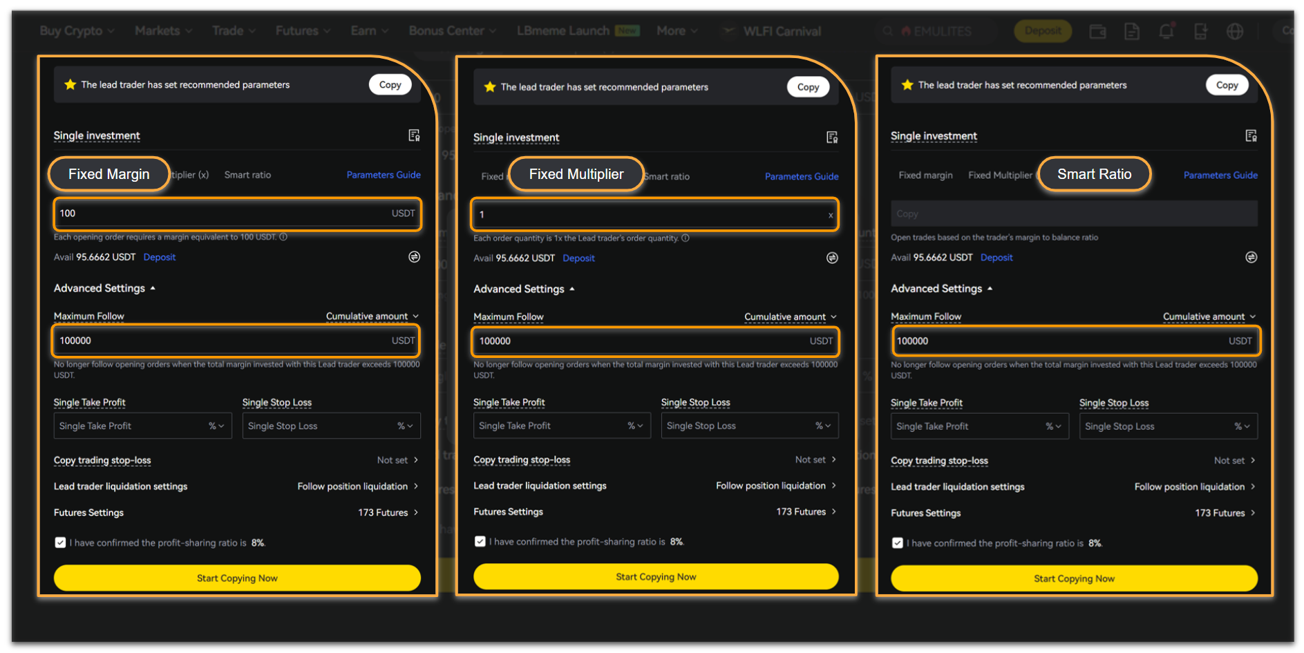 LBank provides three ways to allocate funds for a single copy trading: Fixed Margin, Fixed Multiplier, and Smart Ratio, as shown below: