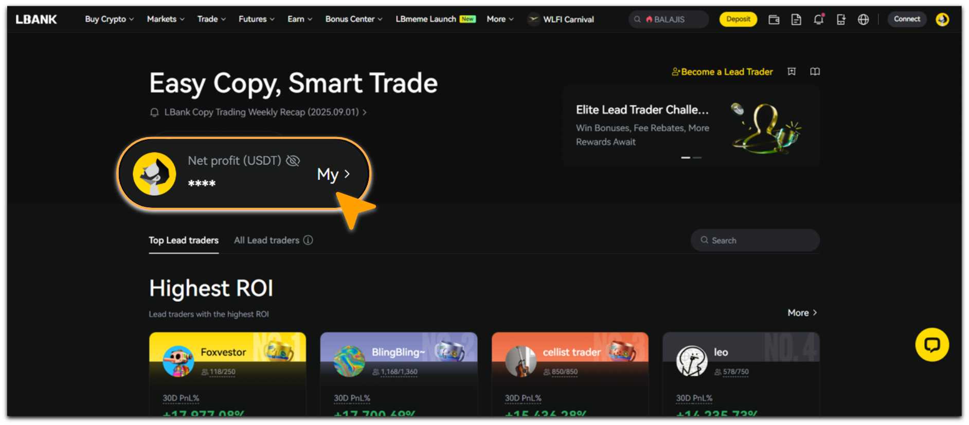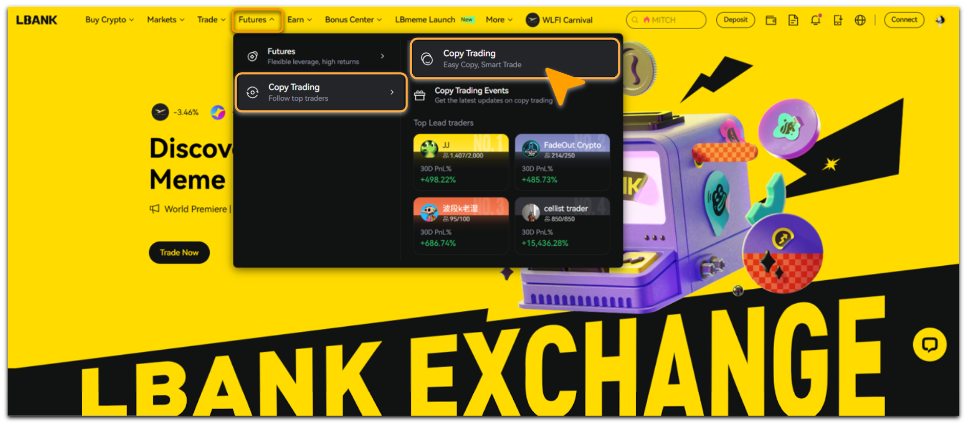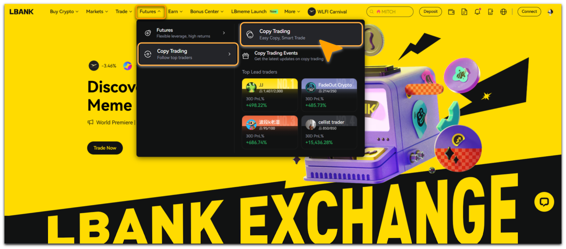 Log in to the LBank, tap [Futures] - [Copy Trading] ,select [Copy Trading];