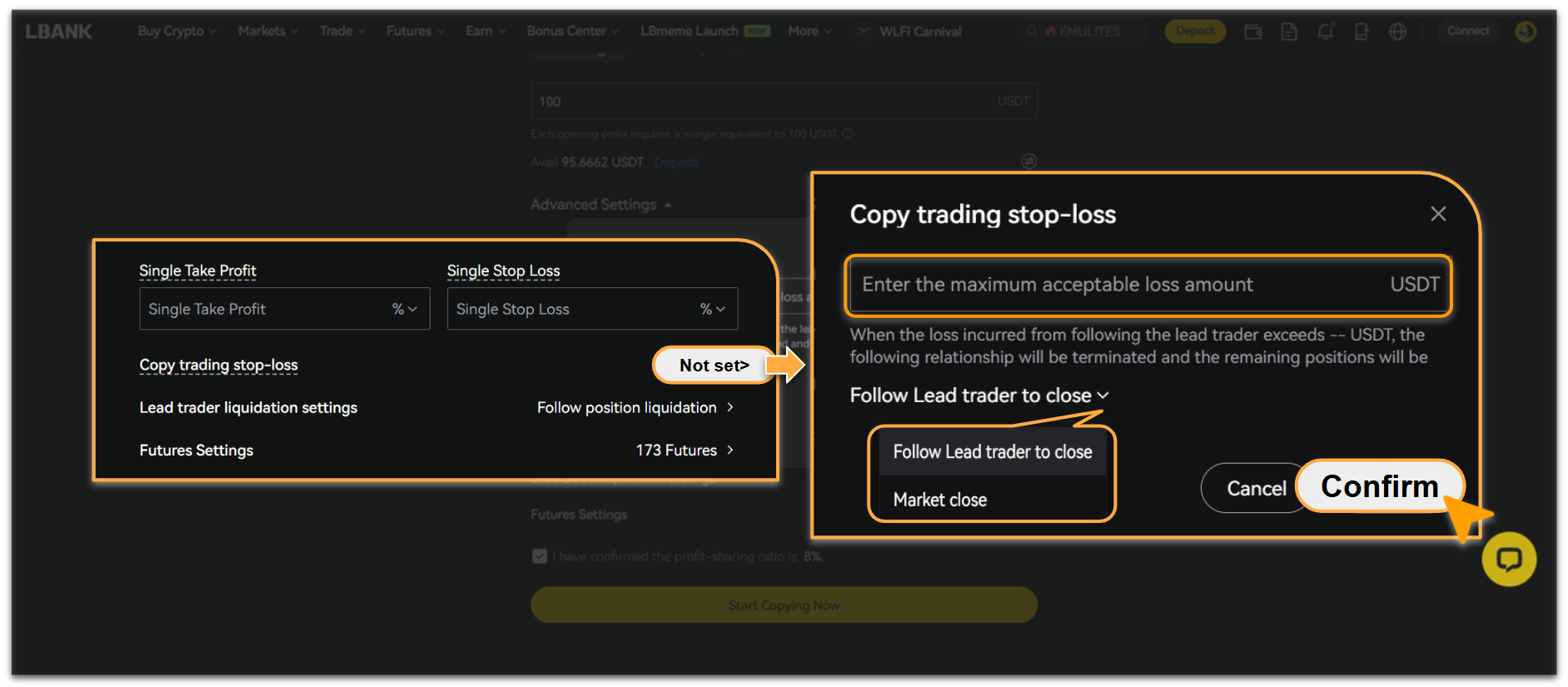Remaining positions will either [Follow lead trader to close] or [Market close];