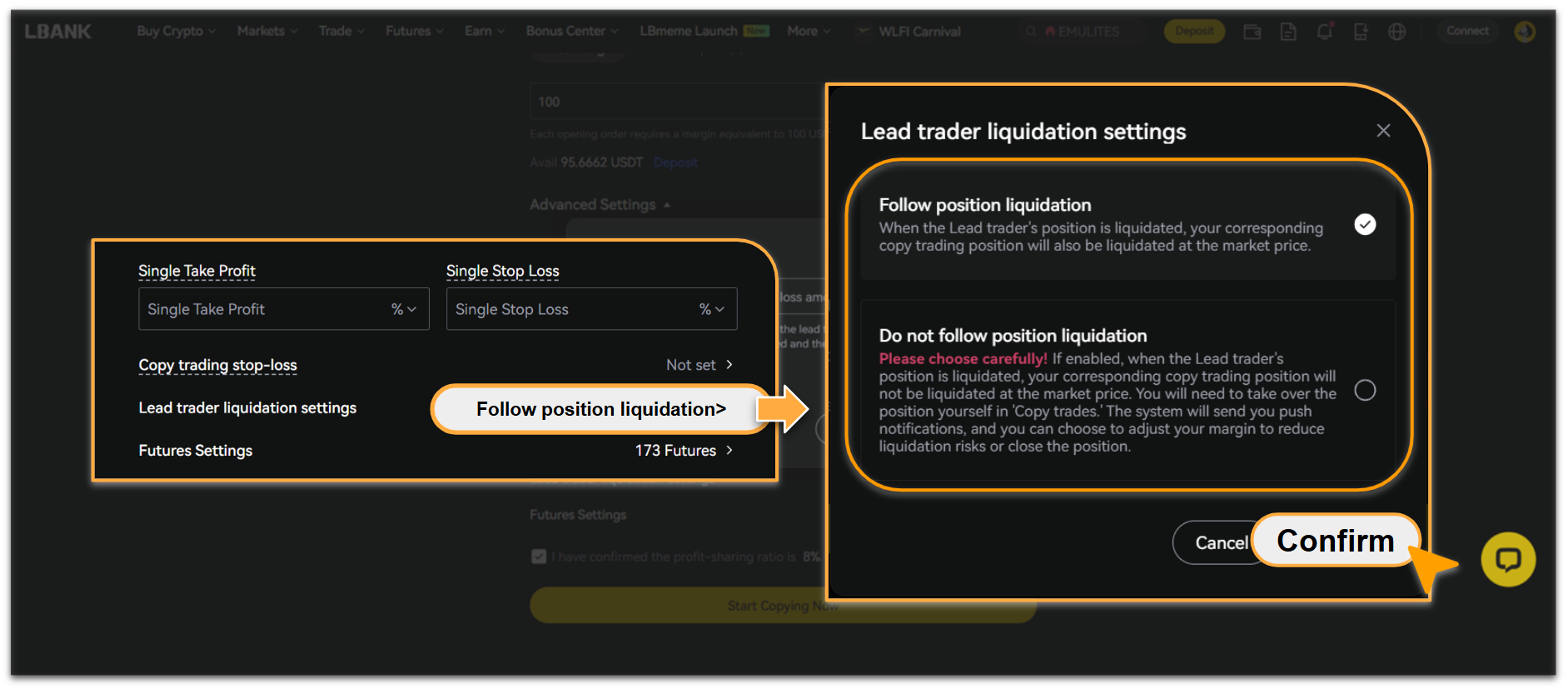 Optionally, set [Lead trader liquidation settings]. [Follow position liquidation] is set as default, but you can switch to [Do not follow position liquidation] and adjust margin or close positions manually.