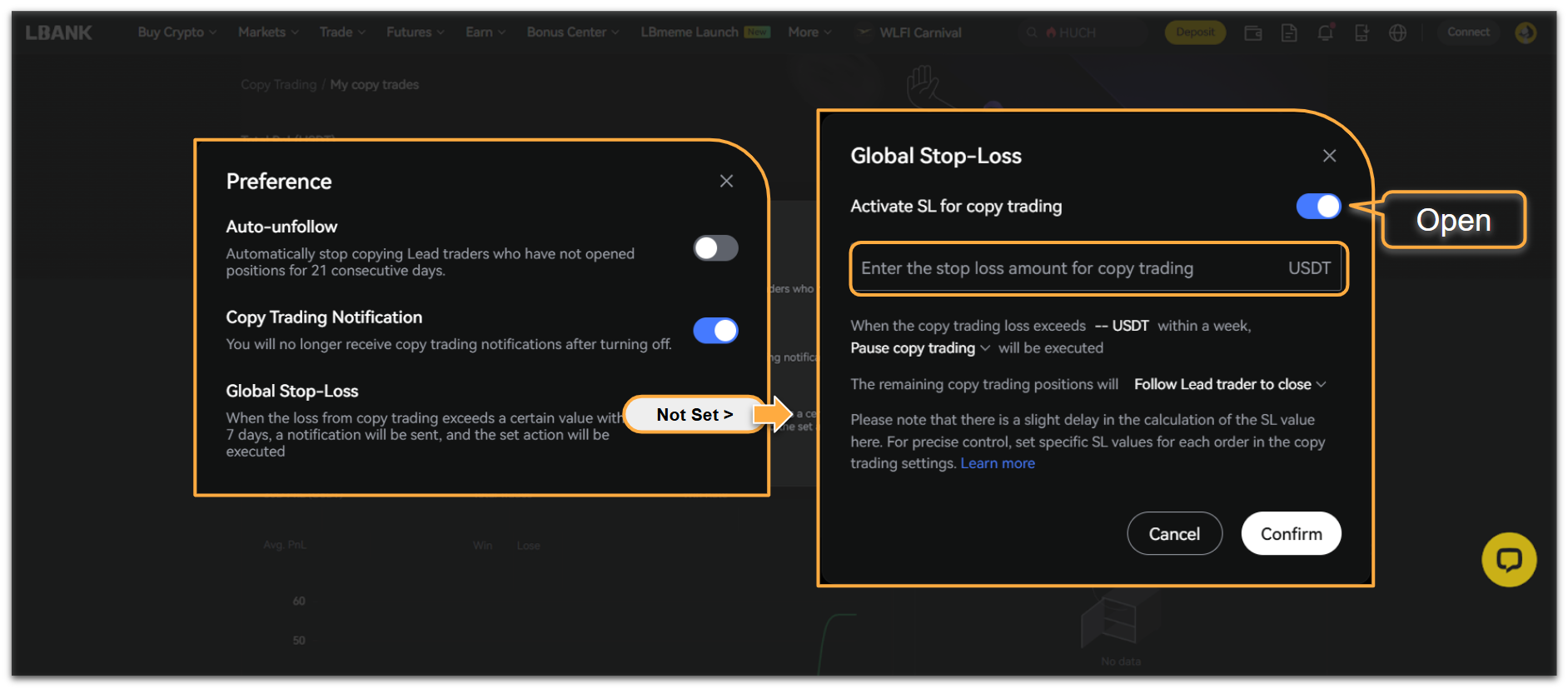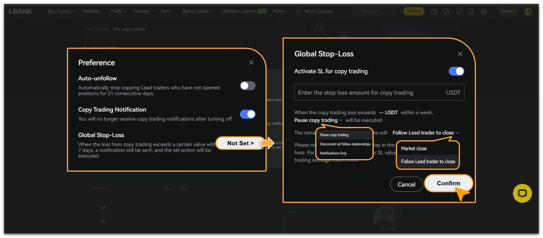 LBank copy trading offers two risk control modes: Per Lead Trader and Global. The parameter settings for each mode are as follows: